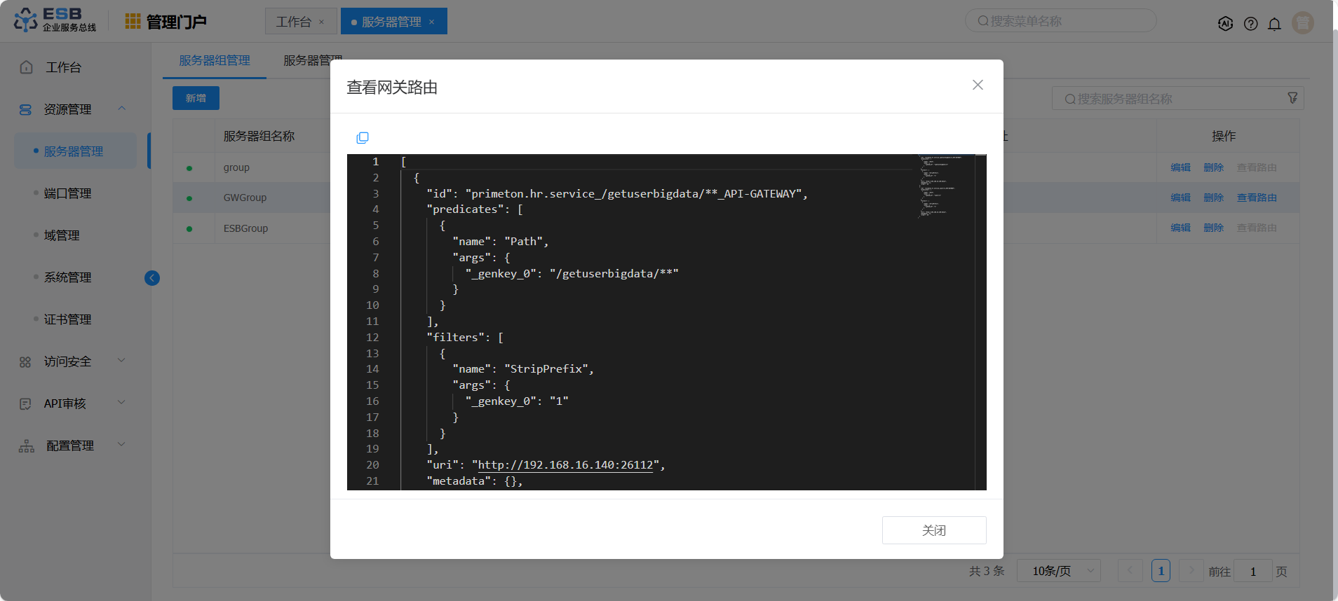 在“服务器组管理”界面,选择“服务器组类型”为“Gateway”服务器组,在操作列点击“查看路由”按钮,弹出网关路由配置信息界面。