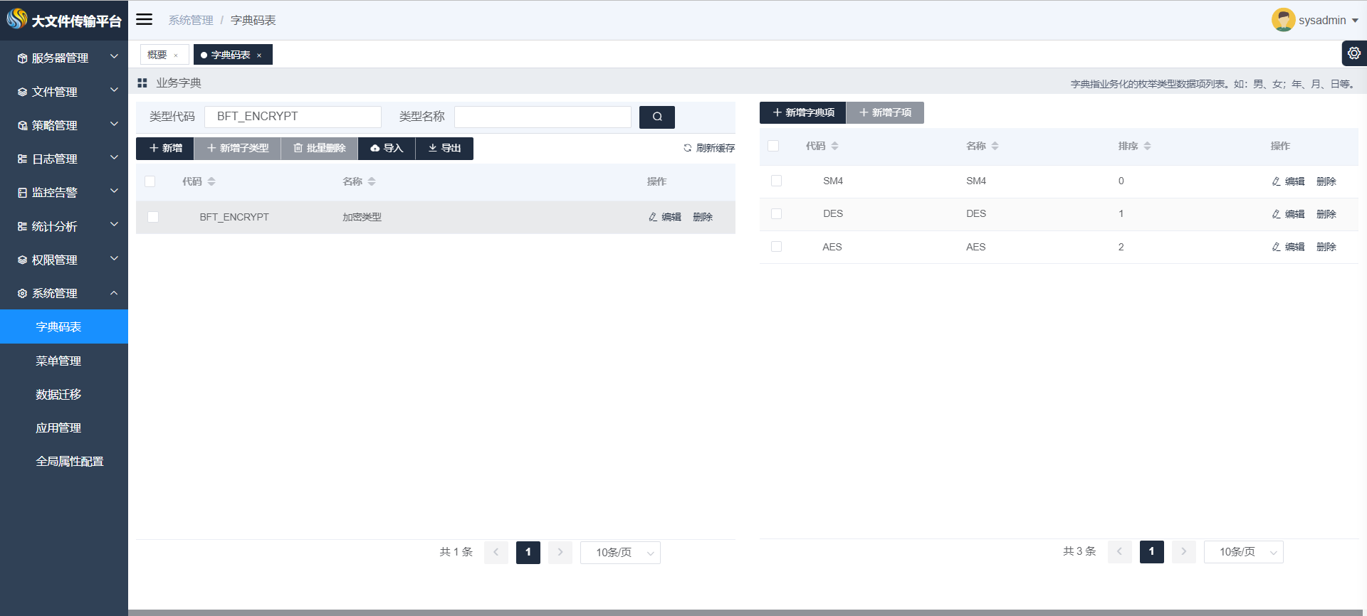 | 名称 | 说明 | | :--------- | :----------------------------------------------------------- | | 字典类型 | 固定值,代表加密类型,不可填写 | | 字典项代码 | 与配置文件%BFT_AGENT%\bftagent\config\bft-agent-corder-conf.xml的name保持一致 | | 字典项名称 | 自定义加密的标识,可以填写通俗名称 | | 排序 | 该加密类型的显示位置 |