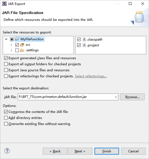 选择要打包的内容,配置项保持默认值,在“JAR file”选择输出目录,点击“Finish”。