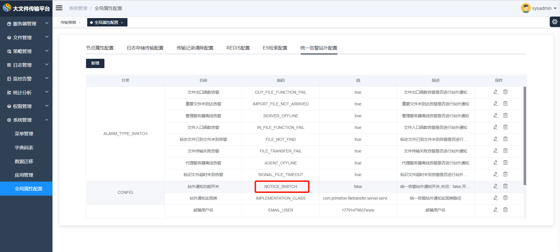 在BFT Console中点击菜单【系统管理】>【全局属性配置】,点击【统一告警站外配置】标签页