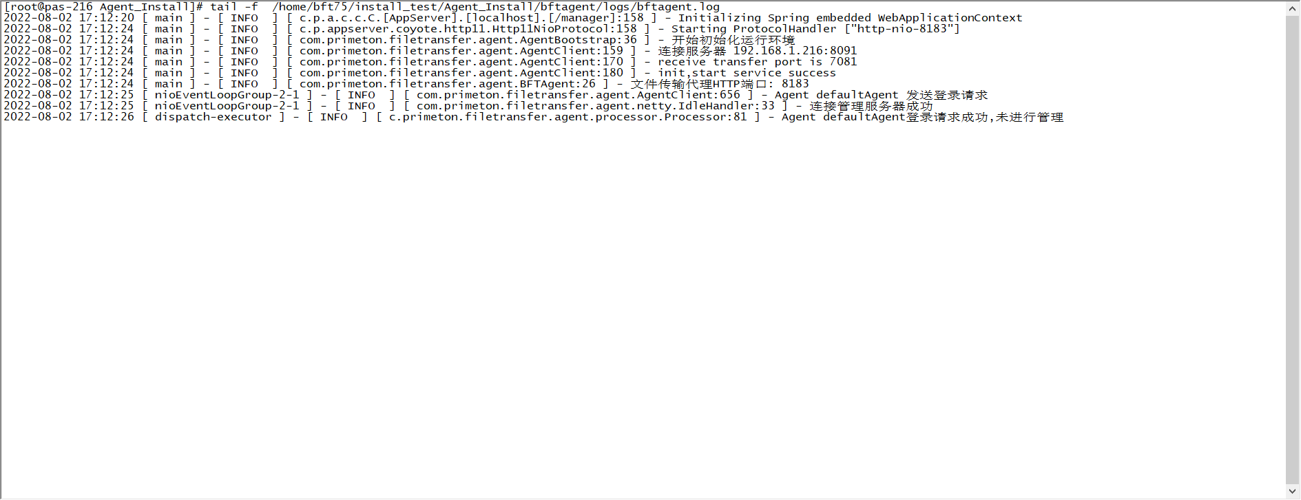 [root@pas-216]$ tail -f /home/bft75/install_test/Agent_Install/bftagent/logs/bftagent.log