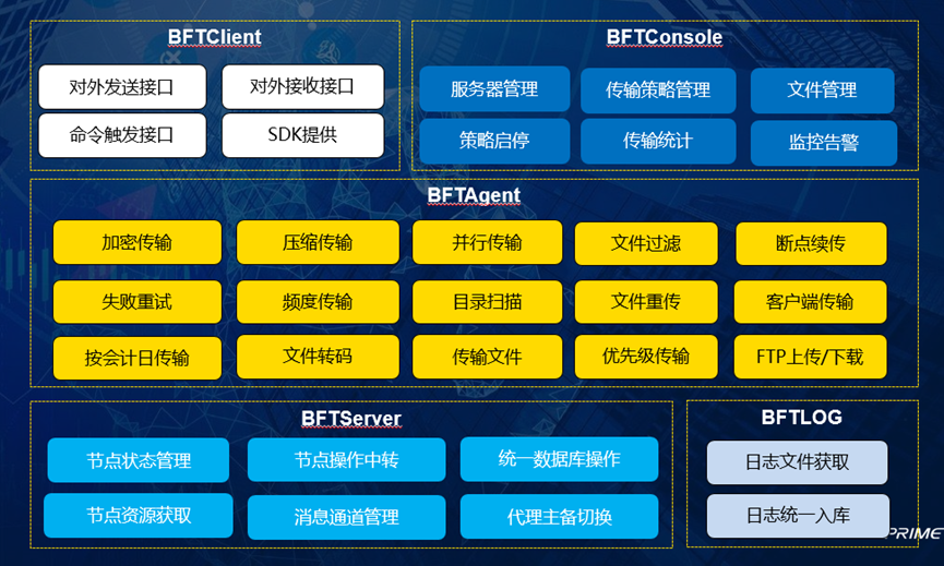 文件传输产品包括五个模块:BFTConsole(控制管理中心)、BFTServer(管理节点)、BFTAgent(代理节点)、BFTClient(传输客户端)、BFTLogCenter(日志中心),产品功能架构如下图所示: