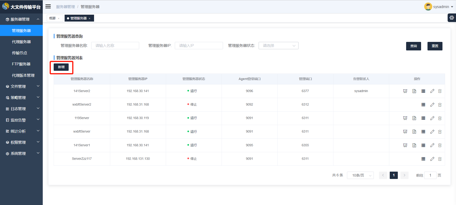 在控制管理中心点击菜单【服务器管理】>【管理服务器】,点击“新增”按钮,添加BFT Server,配置界面如下图所示