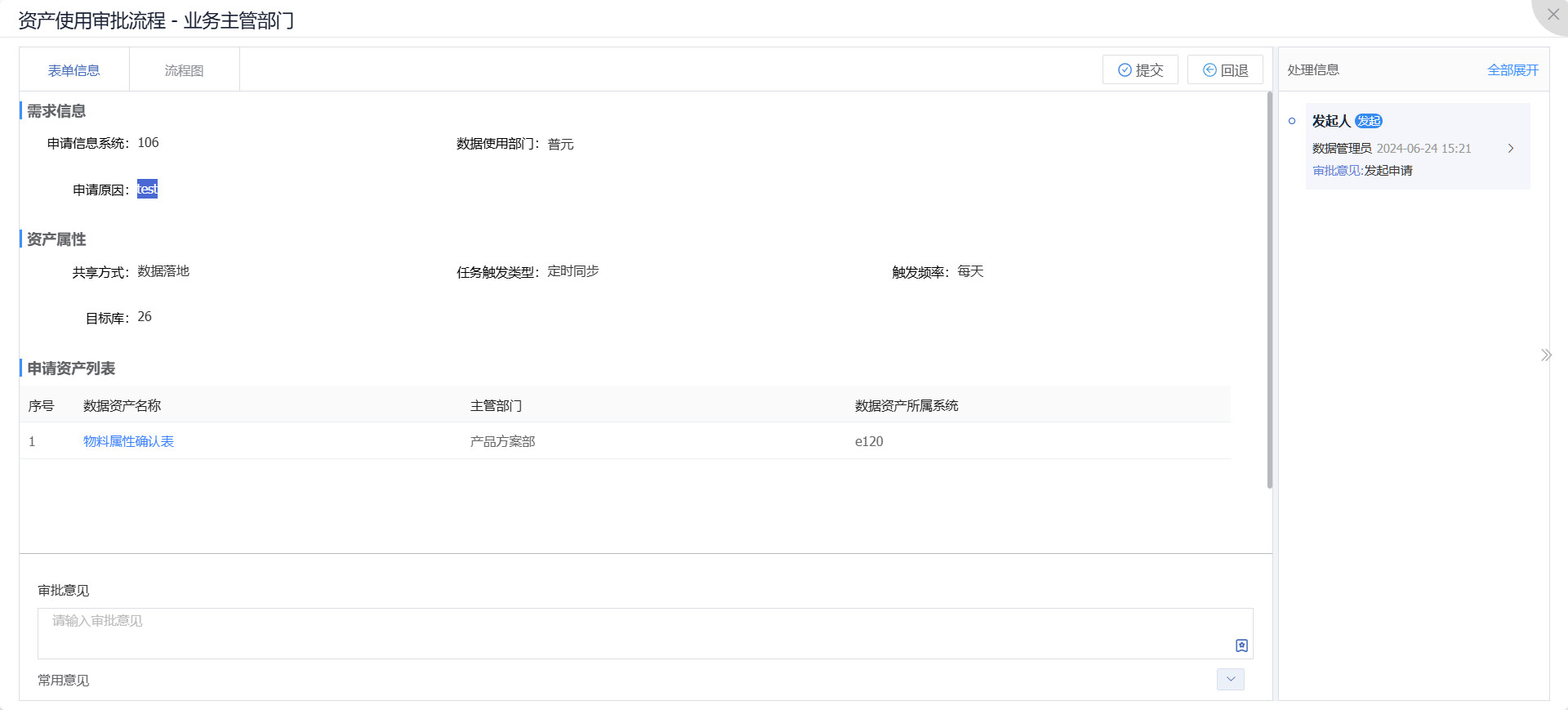审批环节第一步为业务部门审批主要是对合规性和数据权责的确认,审批人需拥有资产部门管理员角色,如果该部门下没有员工拥有资产部门管理员角色则由资产管理员dtadmin审批。