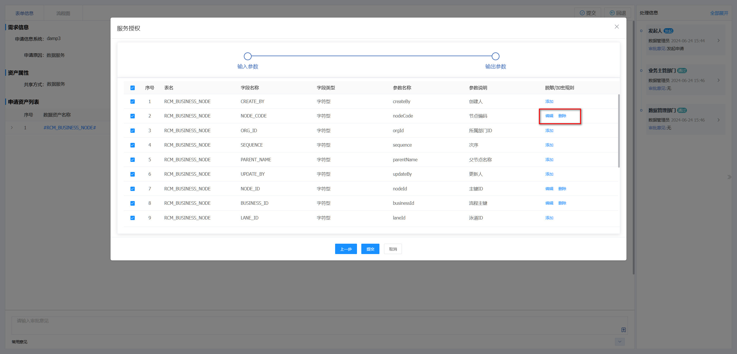 共享方式为数据服务时,点击“服务授权”按钮,会弹出资源的参数信息,如果该资源为基于元数据编制的目录,并且被【数据安全】模块中敏感数据探查定义为敏感字段,会将脱敏规则自动添加进来。