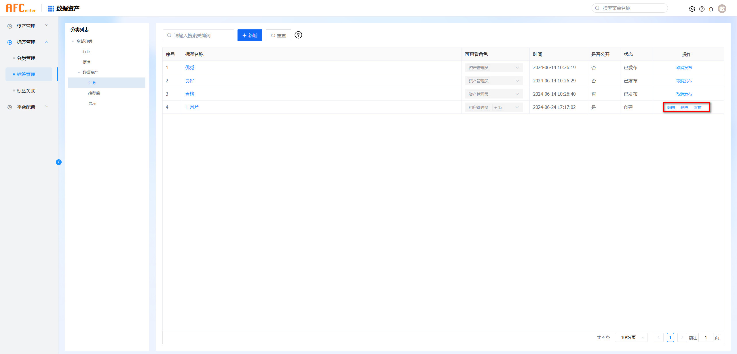 "发布": 点击列表中的“发布”按钮,可以发布标签,发布后的标签可以在关联标签时被搜索到。