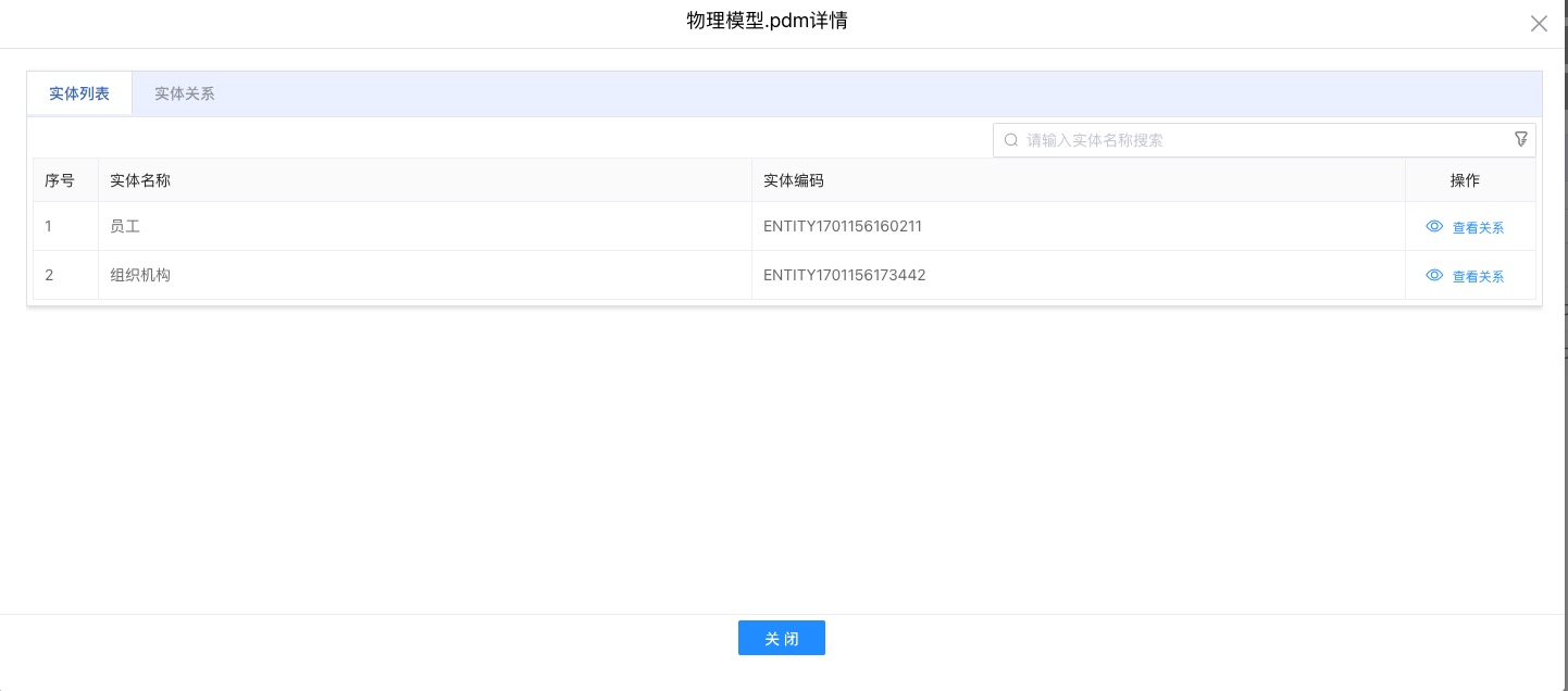 点击列表中的“查看关系”按钮可以查看该模型文件下的实体列表以及实体之间关系的详情展示。