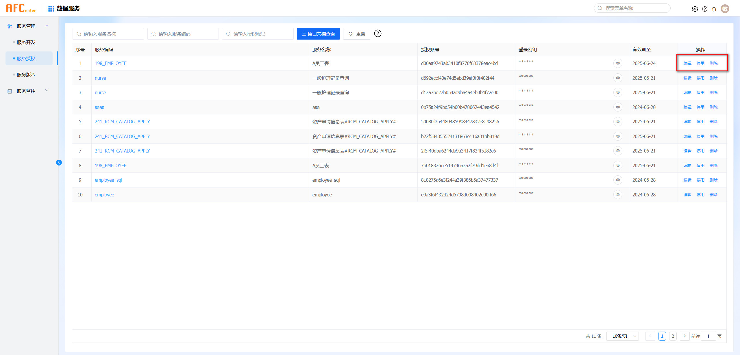 在服务授权支持用户查看已有的授权记录,并支持授权记录做编辑、停用、删除及下载接口调用说明文档等操作。