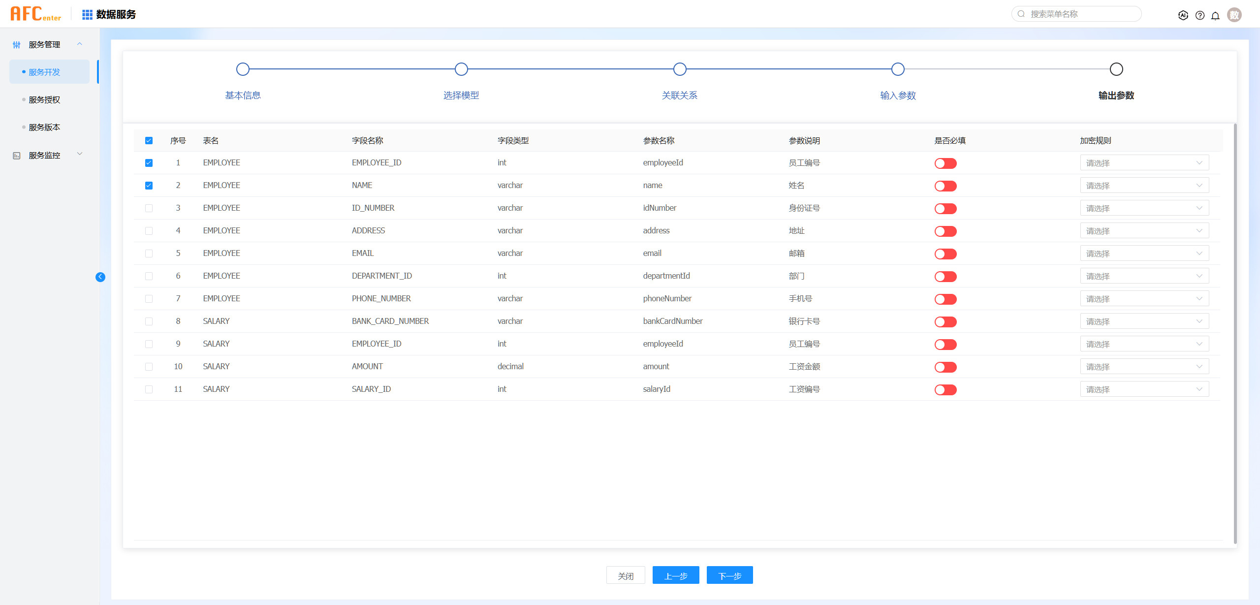 4) 最后一步配置输出参数,系统会根据sql的测试结果展示所有返回值的情况,用户可以选择返回字段进行结果过滤,也可以配置输出字段的加密脱敏规则。此处配置与模型服务相同。配置完成后点击“提交”按钮即可完成服务配置。