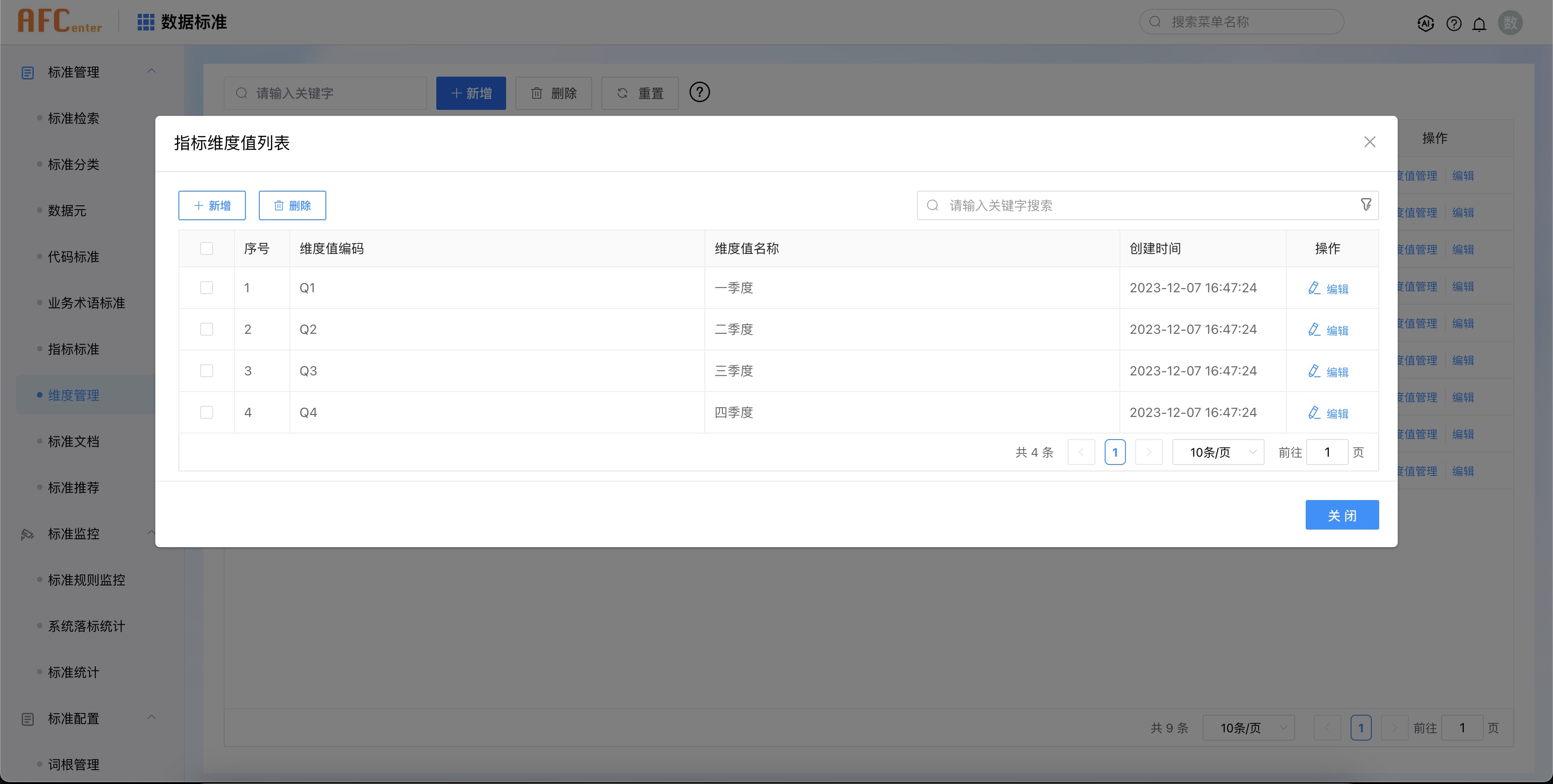 在列表页中操作栏里,支持维度值管理、编辑维度两个操作。点击“维度值管理”进入到维度值维护页面。