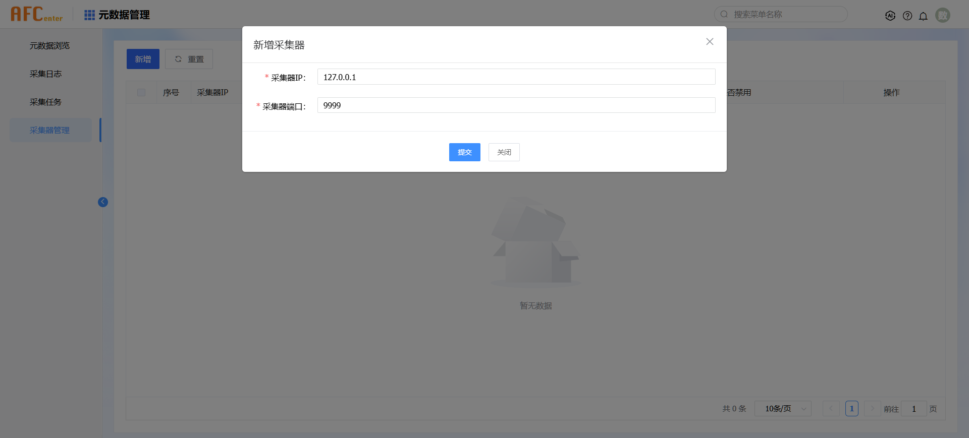 登录系统后在 元数据管理->采集器管理中添加默认采集器