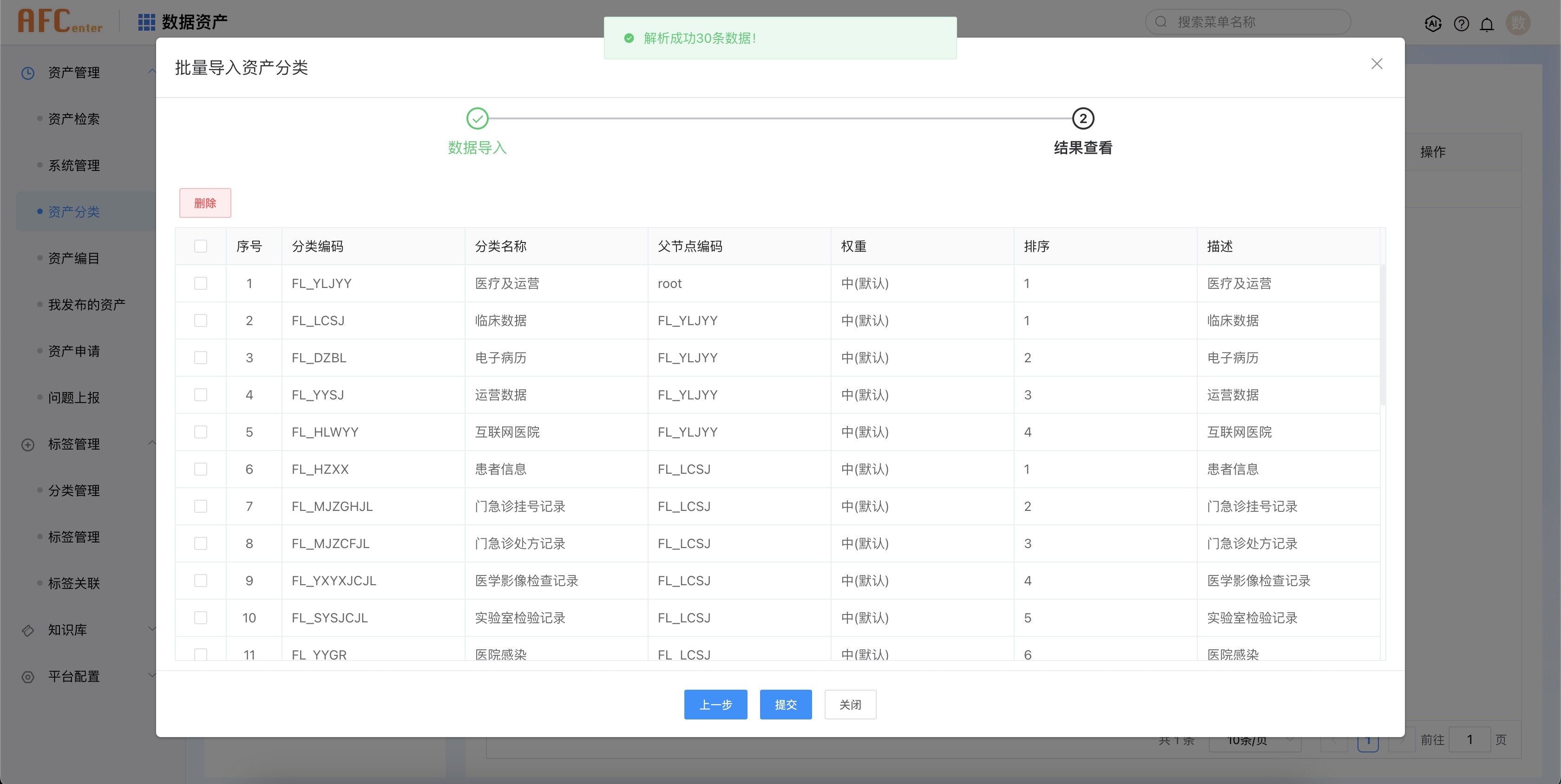 • 步骤四.页面提示解析成功,展示解析后的数据清单。点击【提交】按钮,完成数据导入操作。