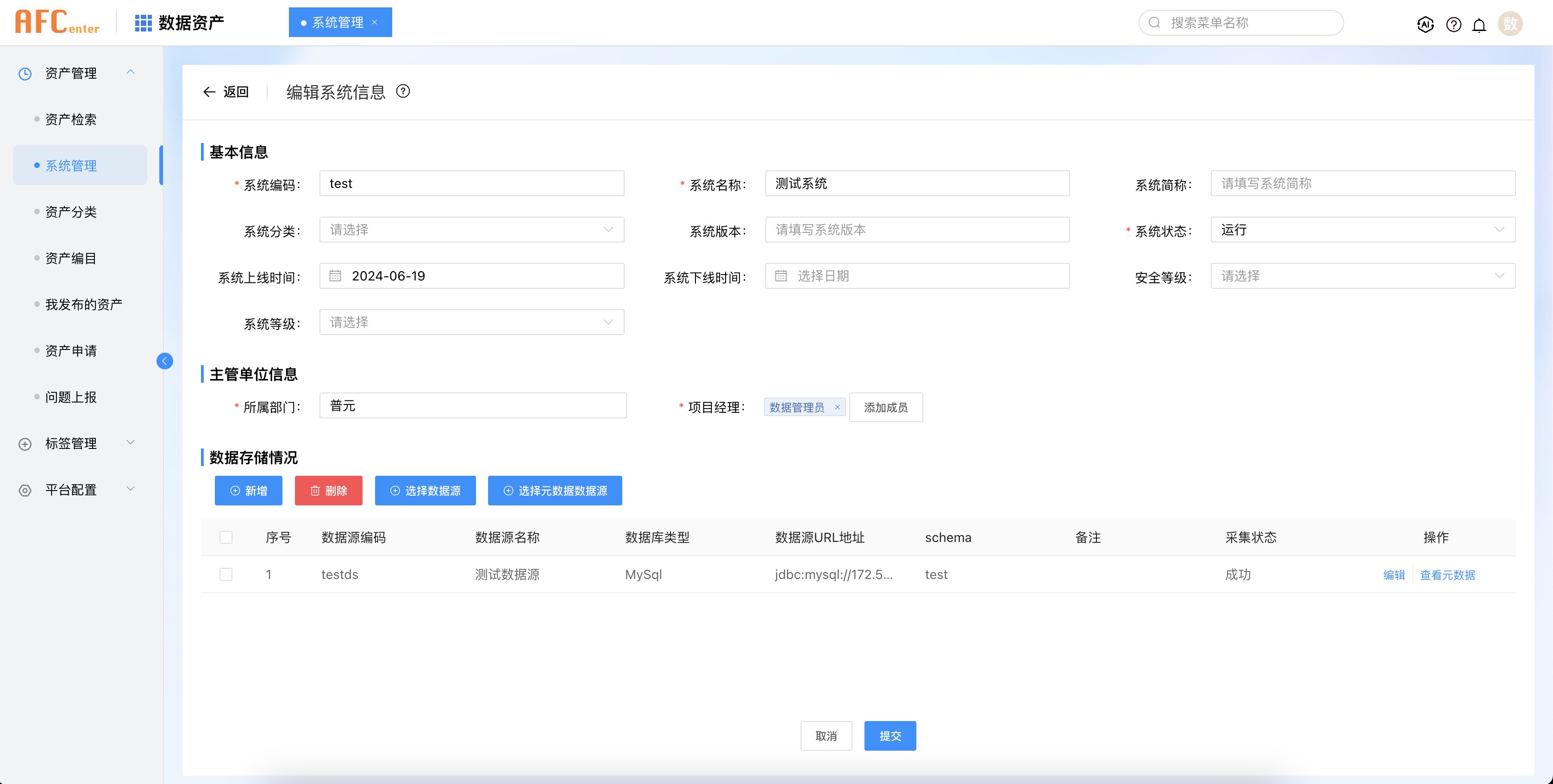 录入信息系统,系统名称为“测试系统”。请保证系统名称一致,否则后续示例数据导入模版会有问题。