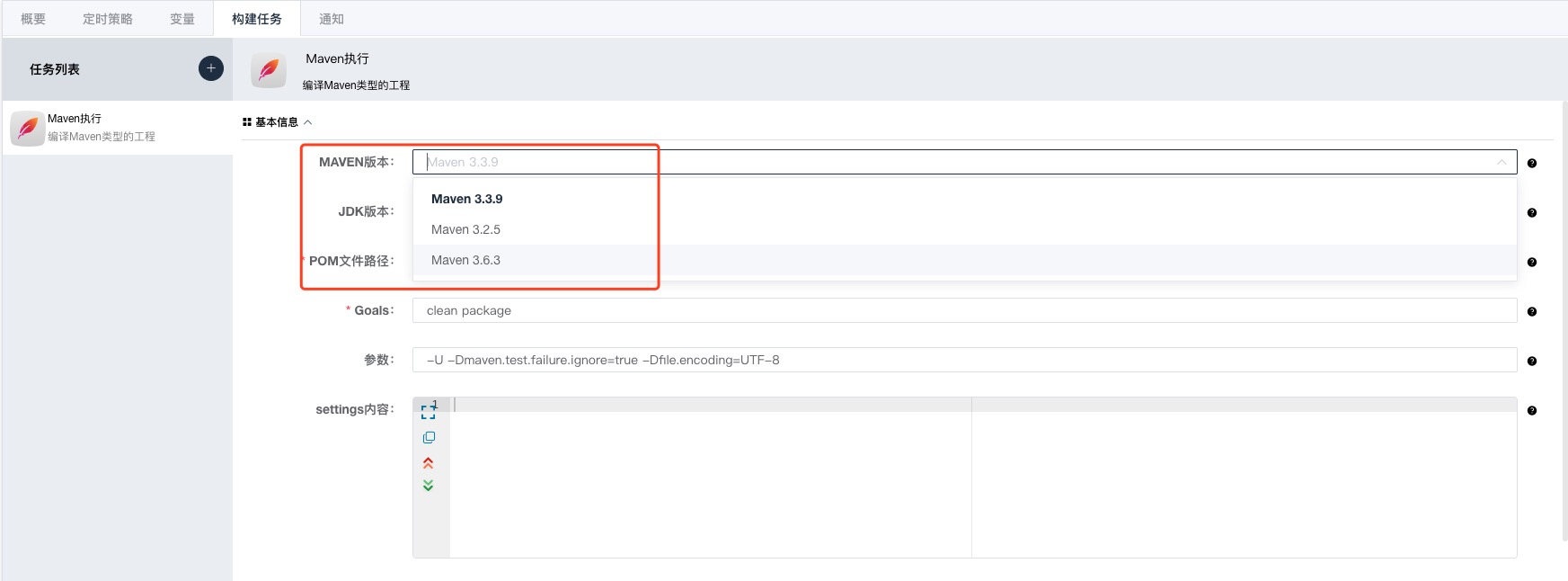 构建任务默认支持工具版本选择下拉框。