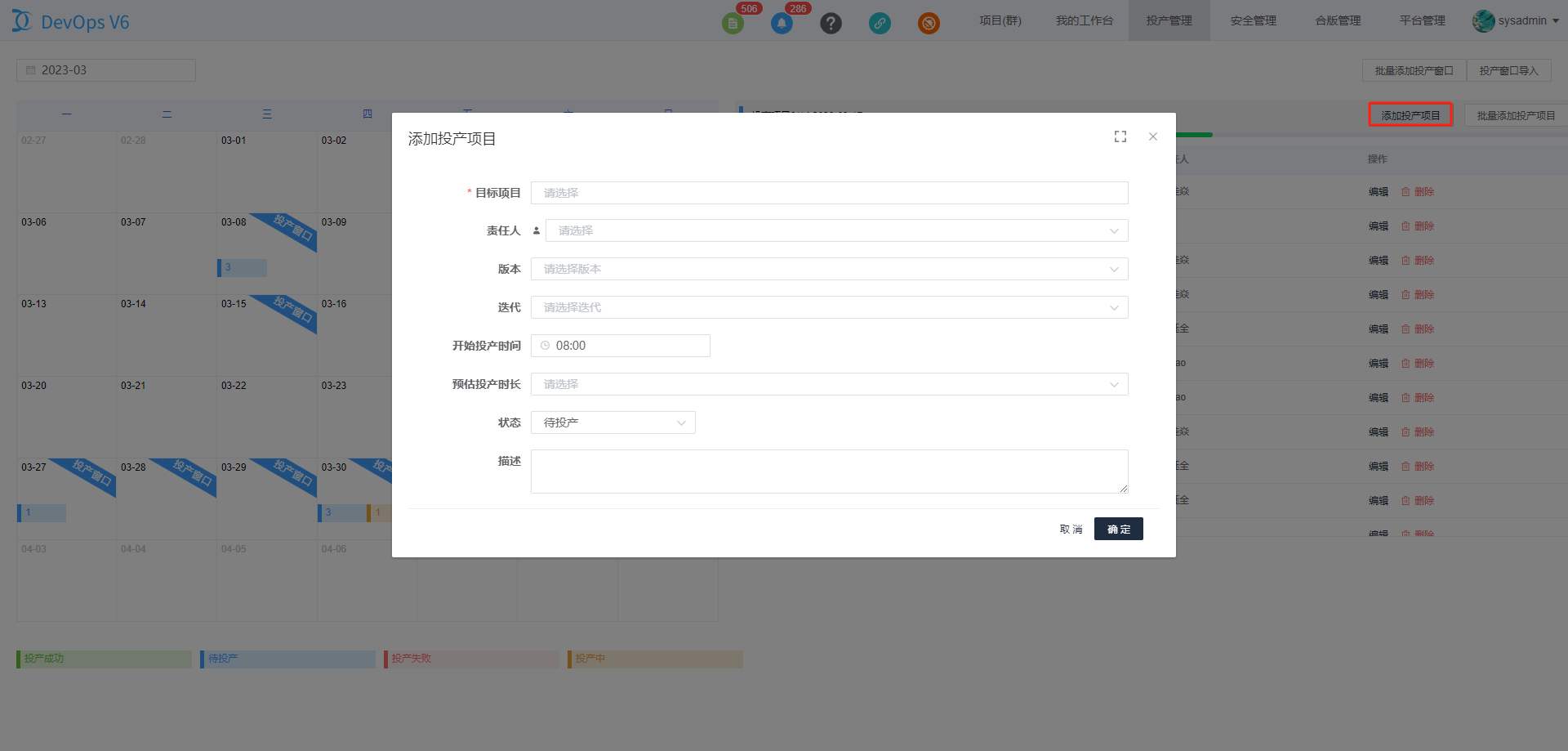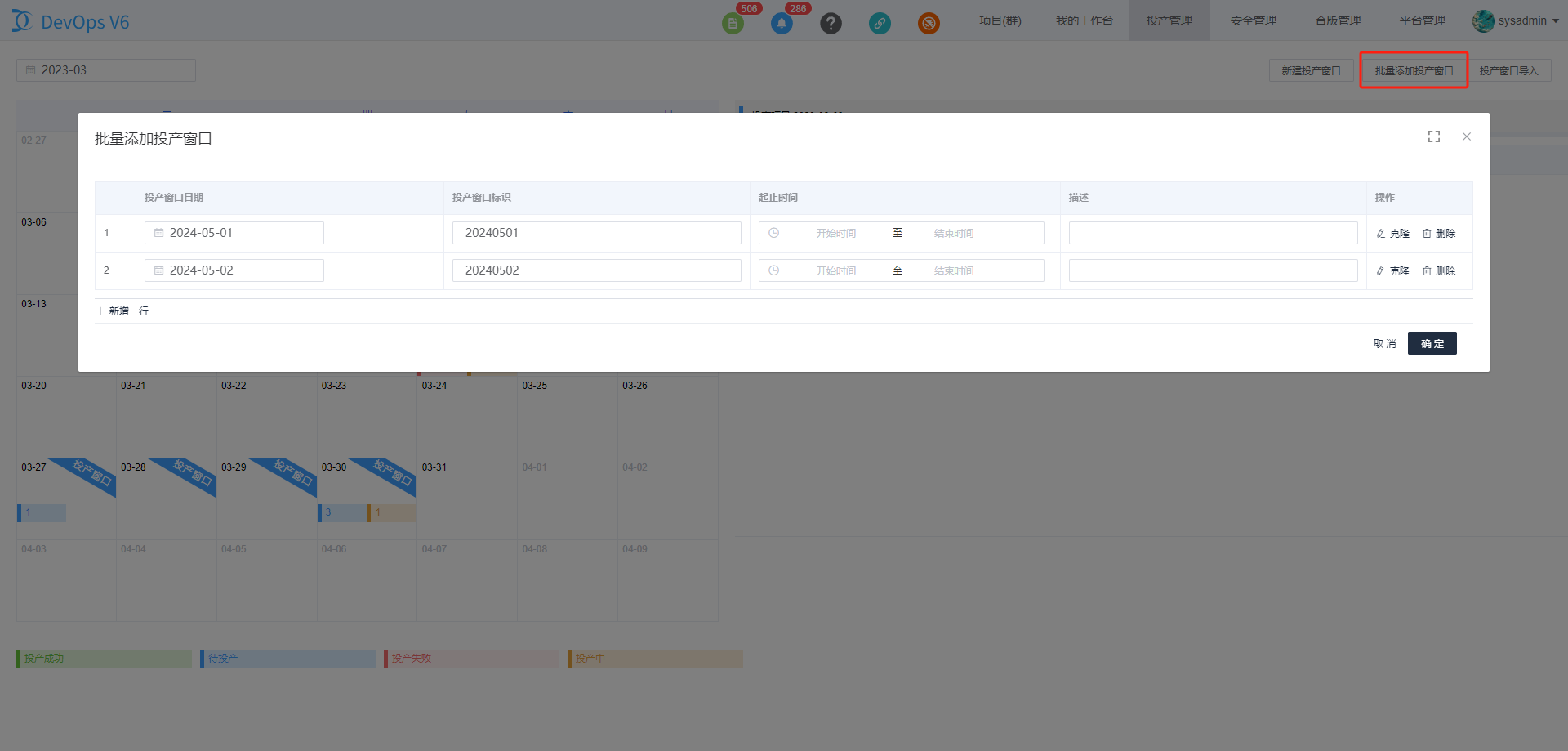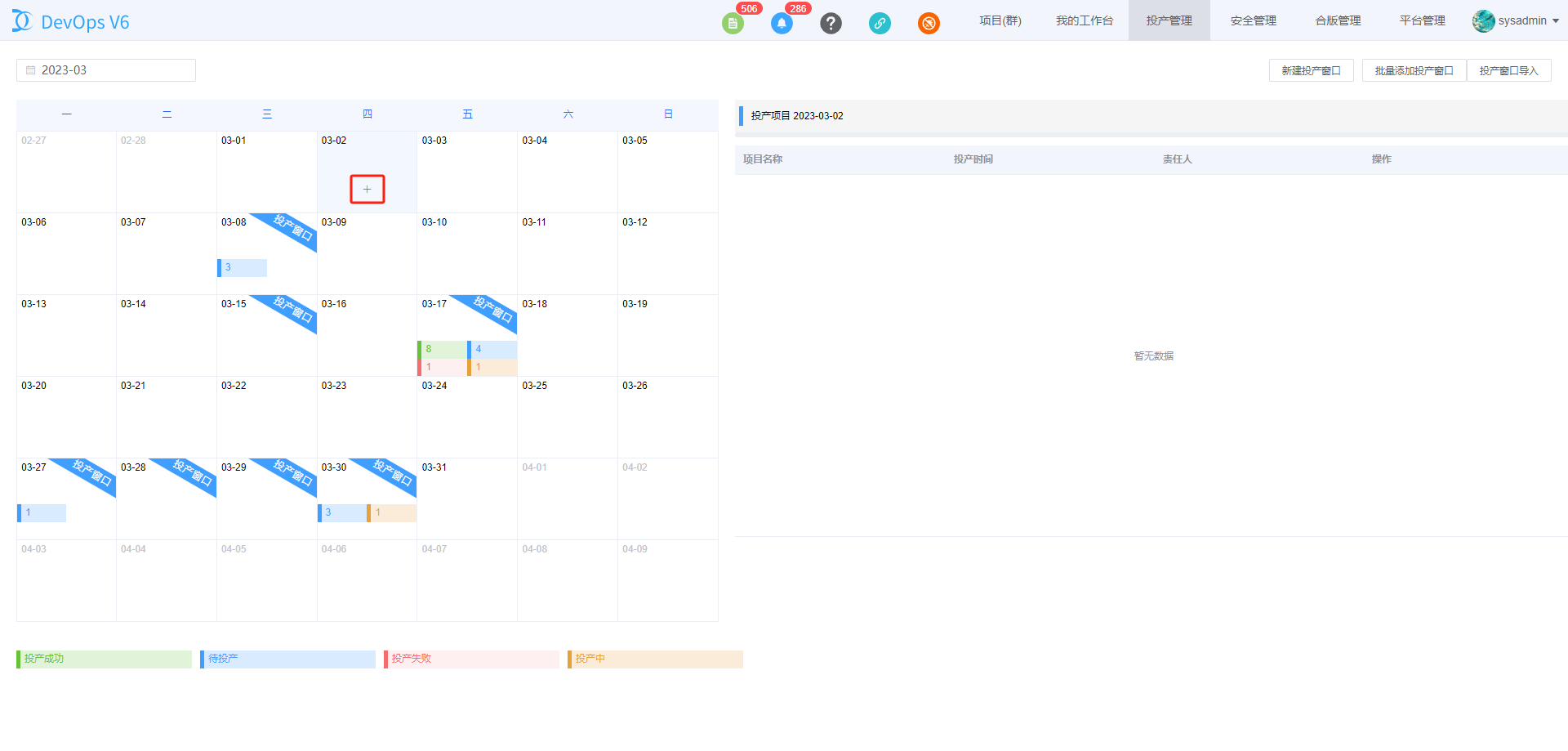 通过DevOps平台上方导航栏的投产窗口进入投产窗口管理页面。