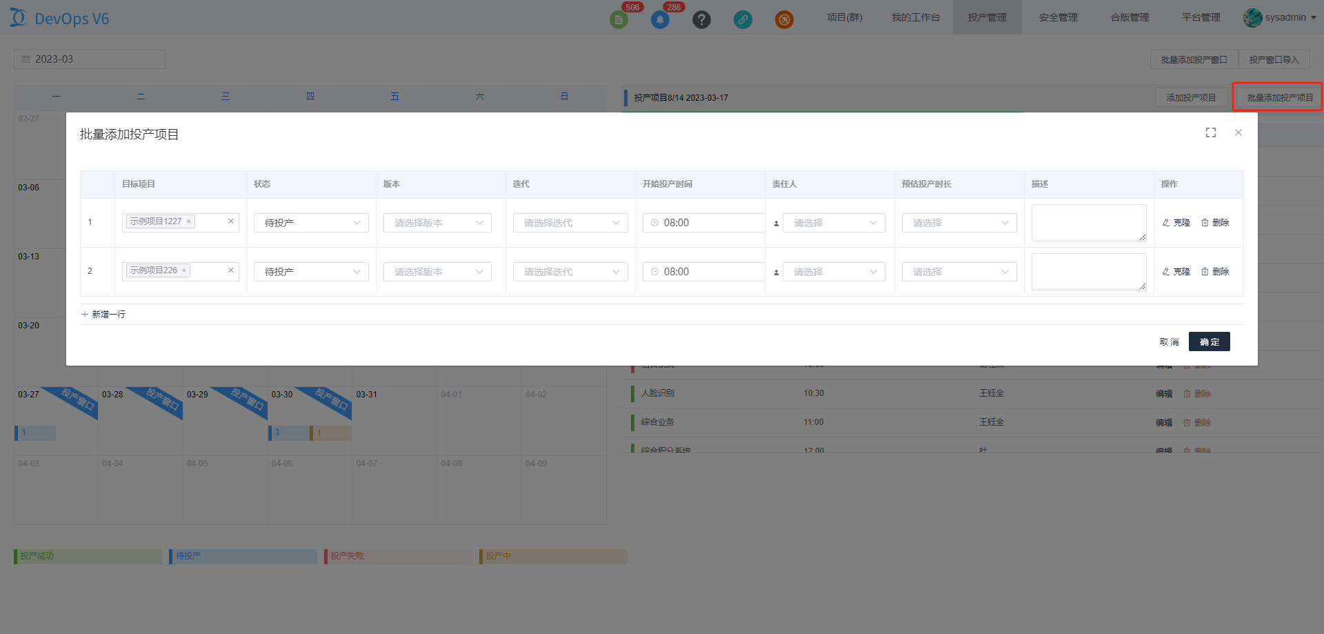 选中已创建好的投产窗口,可以创建或批量创建投产项目。