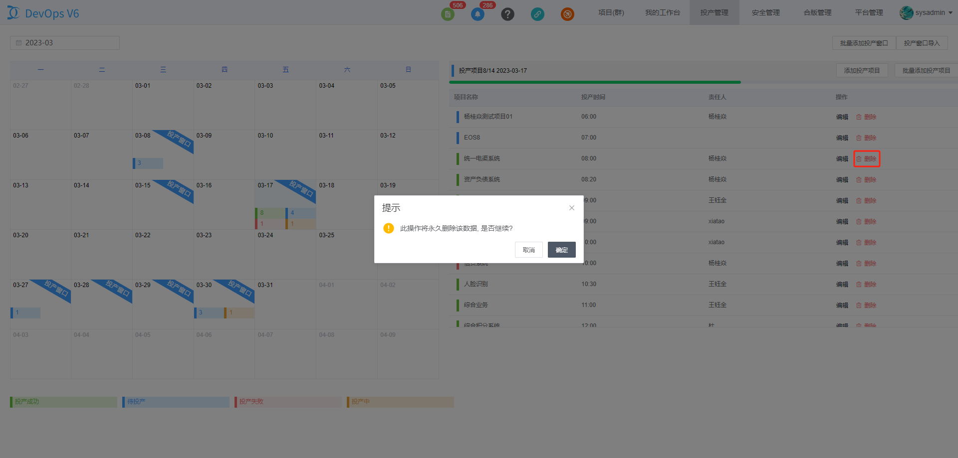 鼠标移至日历中已存在的投产窗口时,可以点击删除按钮来删除投产窗口。