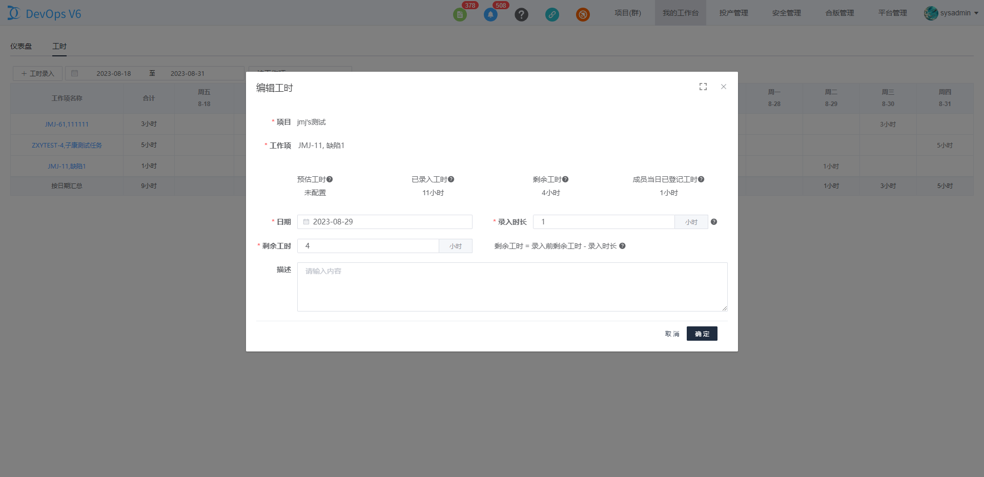 b.新增工时记录时默认为工作项录入前剩余工时减去录入时长,修改已有工时记录时默认为工作项录入前剩余工时,可手动变更,当工时录入成功后,会自动更新对应工作项剩余时间信息。