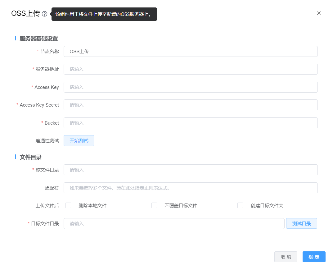 功能介绍:OSS上传用于将文件上传至配置的OSS服务器上
