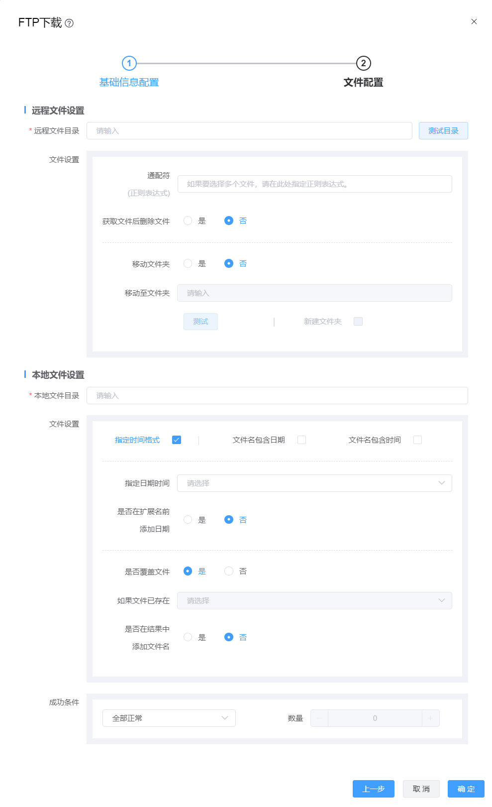| 成功条件 | 全部正常:指定ftp目录下文件全部成功下载,组件执行结果成功 获取文件数不小于:指定ftp目录下成功下载文件数大于该值,组件执行结果成功 错误数小于:指定ftp目录下文件下载失败文件数小于该值,组件执行结果成功 |