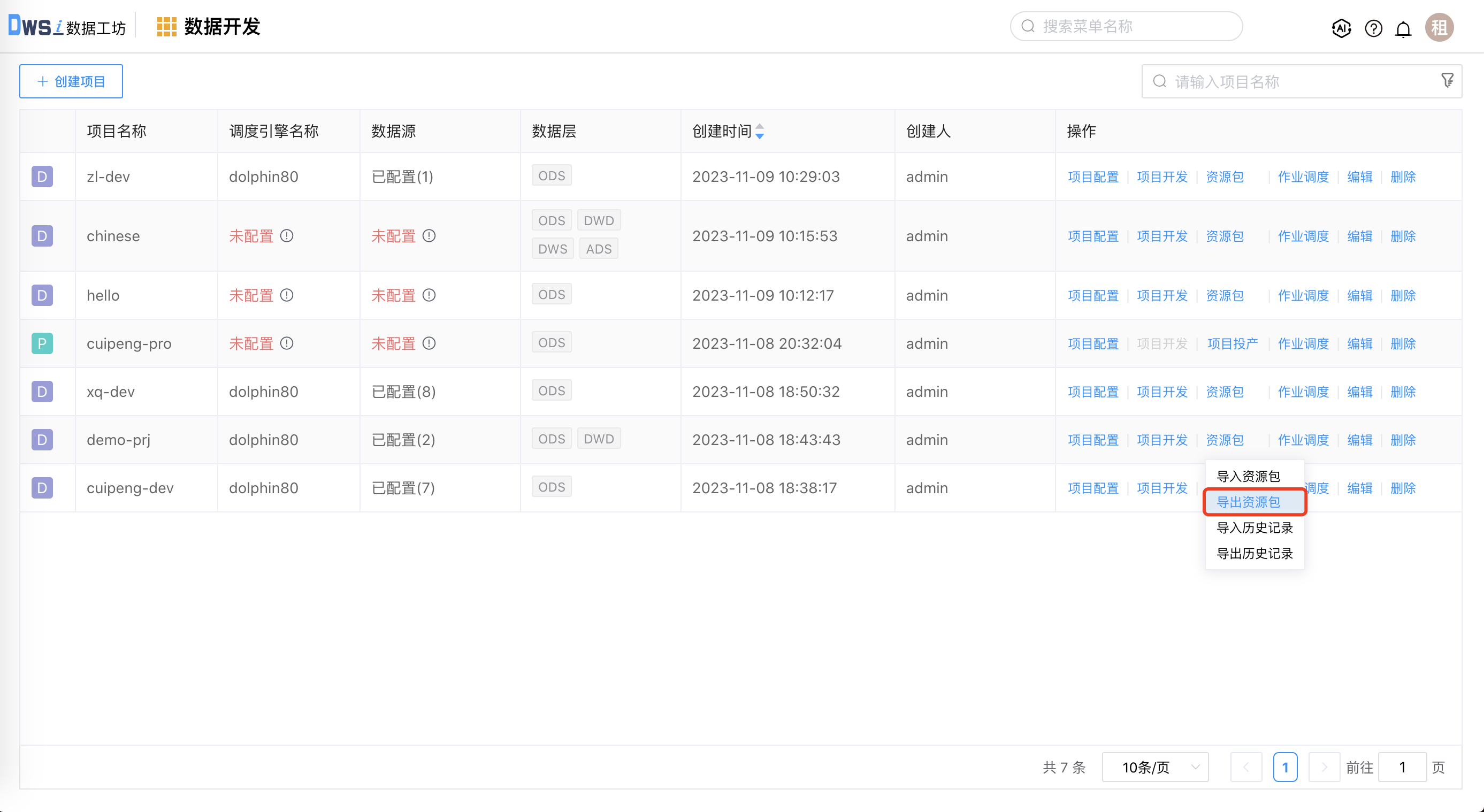 在项目列表中选择某个项目并点击右侧的【资源包】,选择下拉菜单中的【导出资源包】。