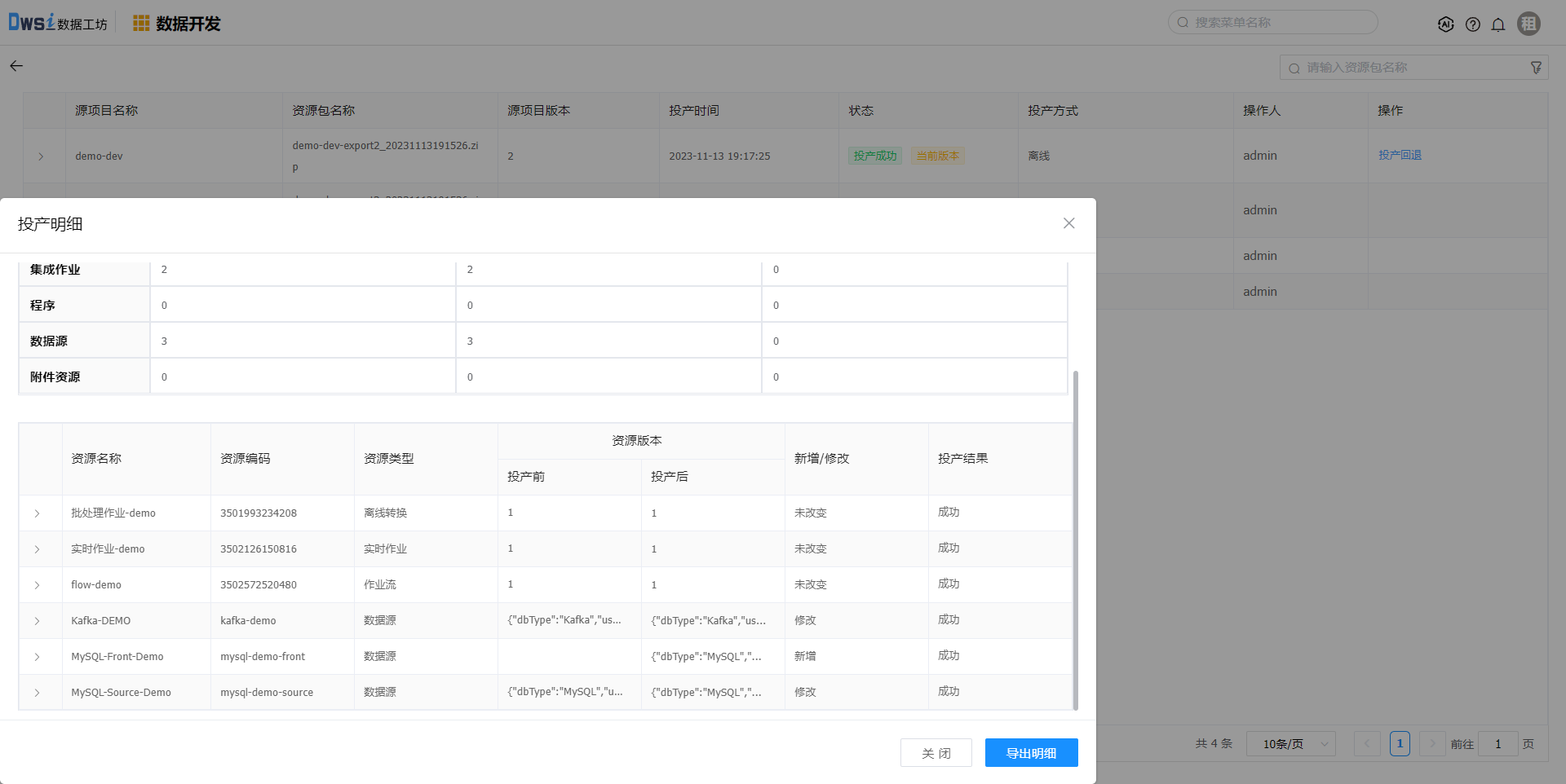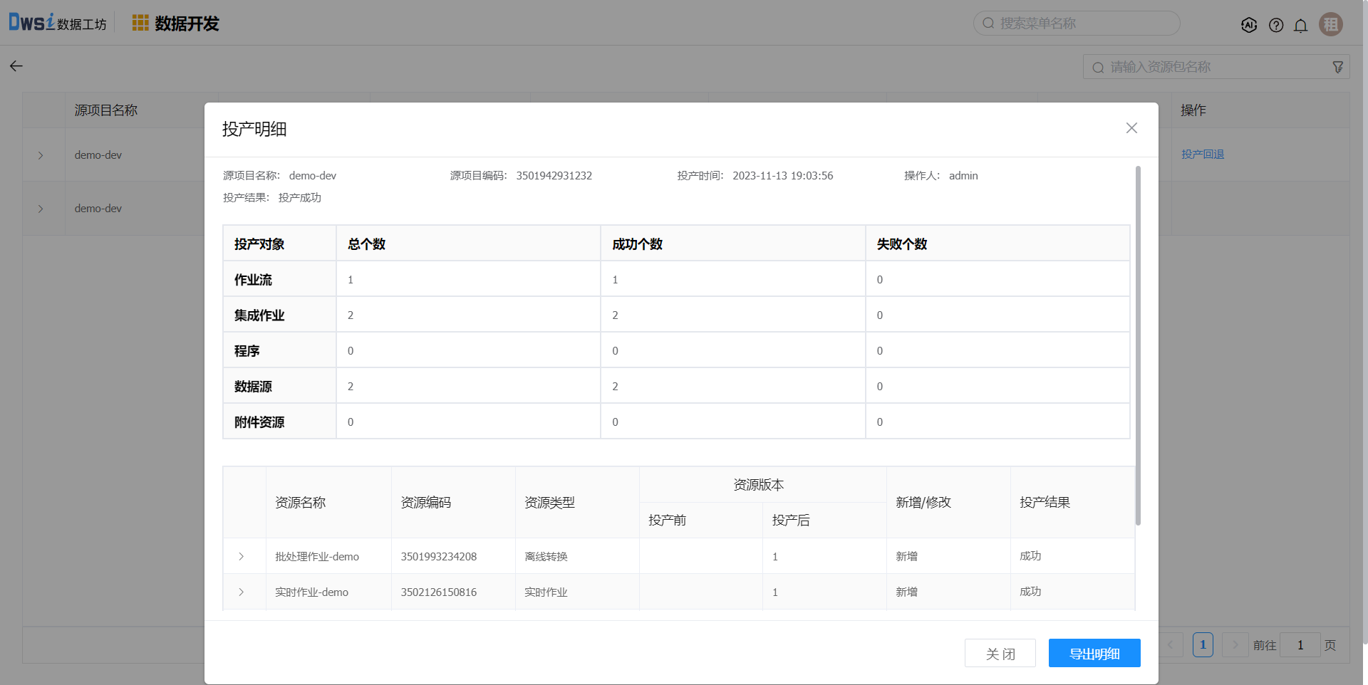 跳转页面显示该项目下所有已导出的资源包信息,点击“在线投产”操作即可直接投产