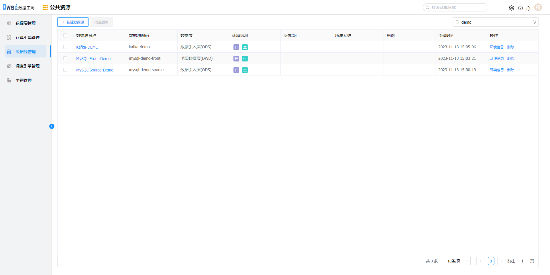 6. 重复上述步骤,创建数据层为DWD层的数据源及kafka数据源。如下图