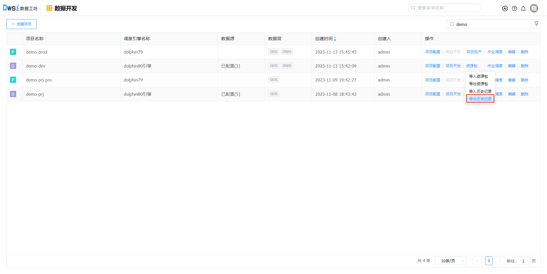 1. 点击上方菜单栏【数据开发】页面,在列表中选择开发项目,点击“资源包->导出资源包”操作。