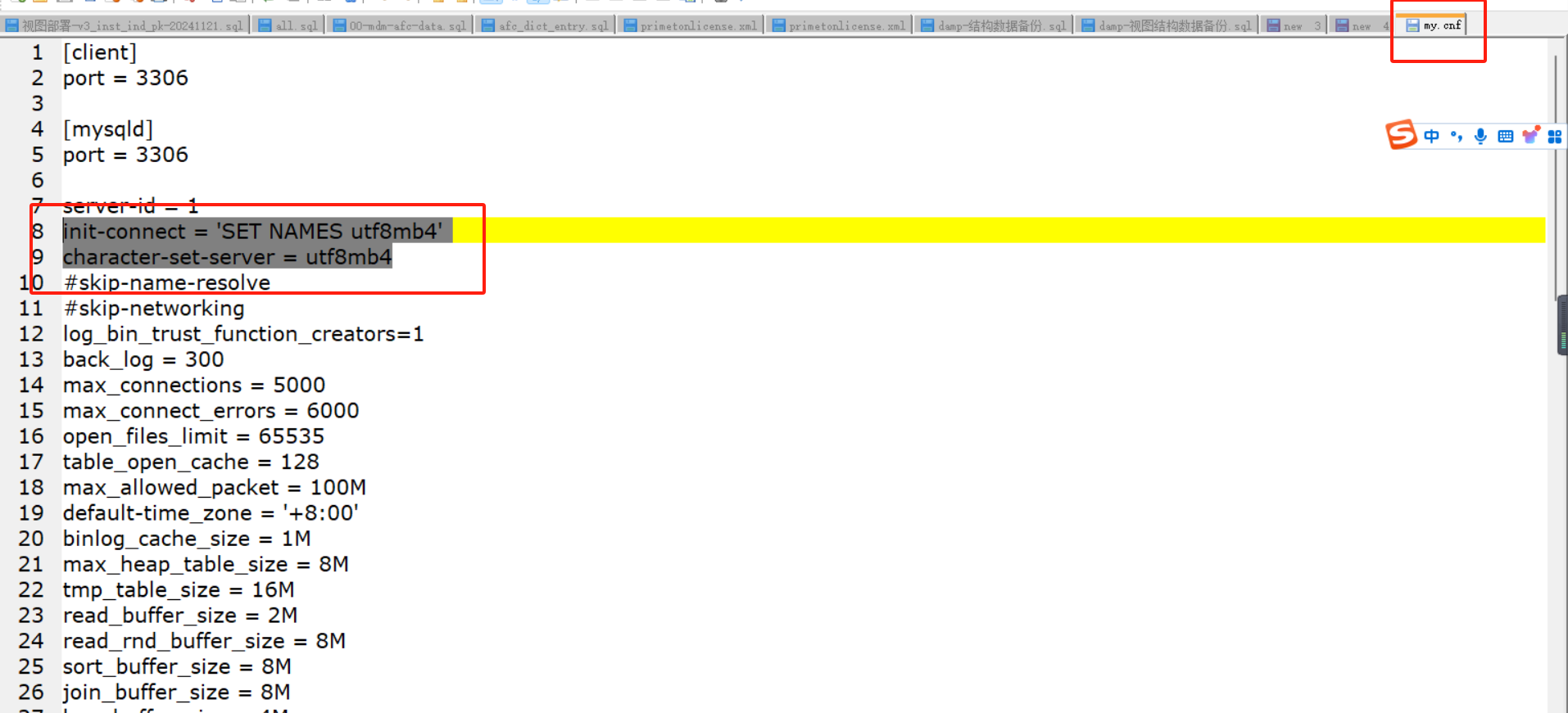 # A:检查目标库数据库编码,如修改数据库编码,在my.cnf增加如下配置