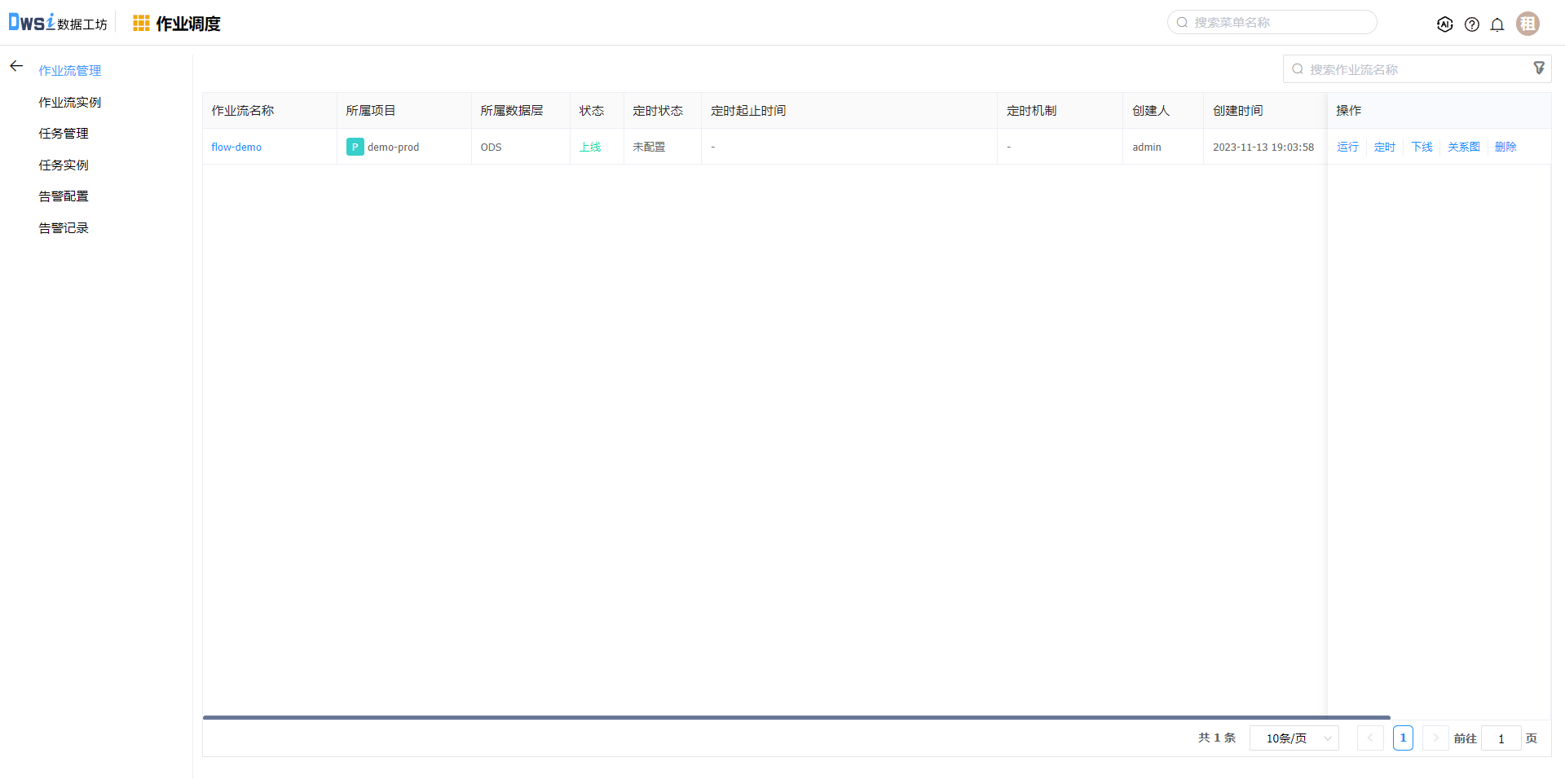 点击上方菜单栏“数据开发”,在【数据开发】页面,选择对应的项目,点击”作业调度“操作,跳转到该项目使用的引擎已提交的作业流页面。