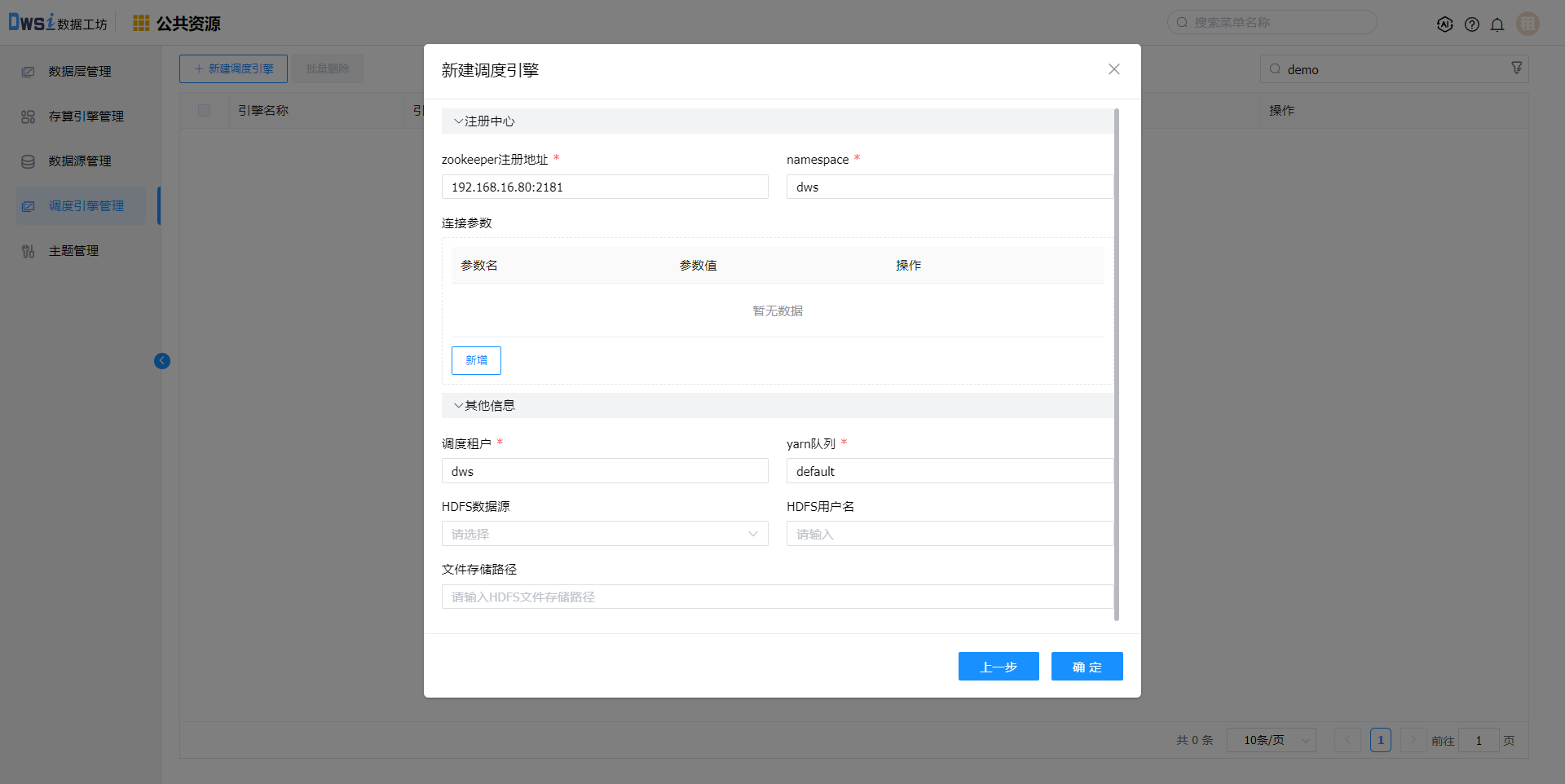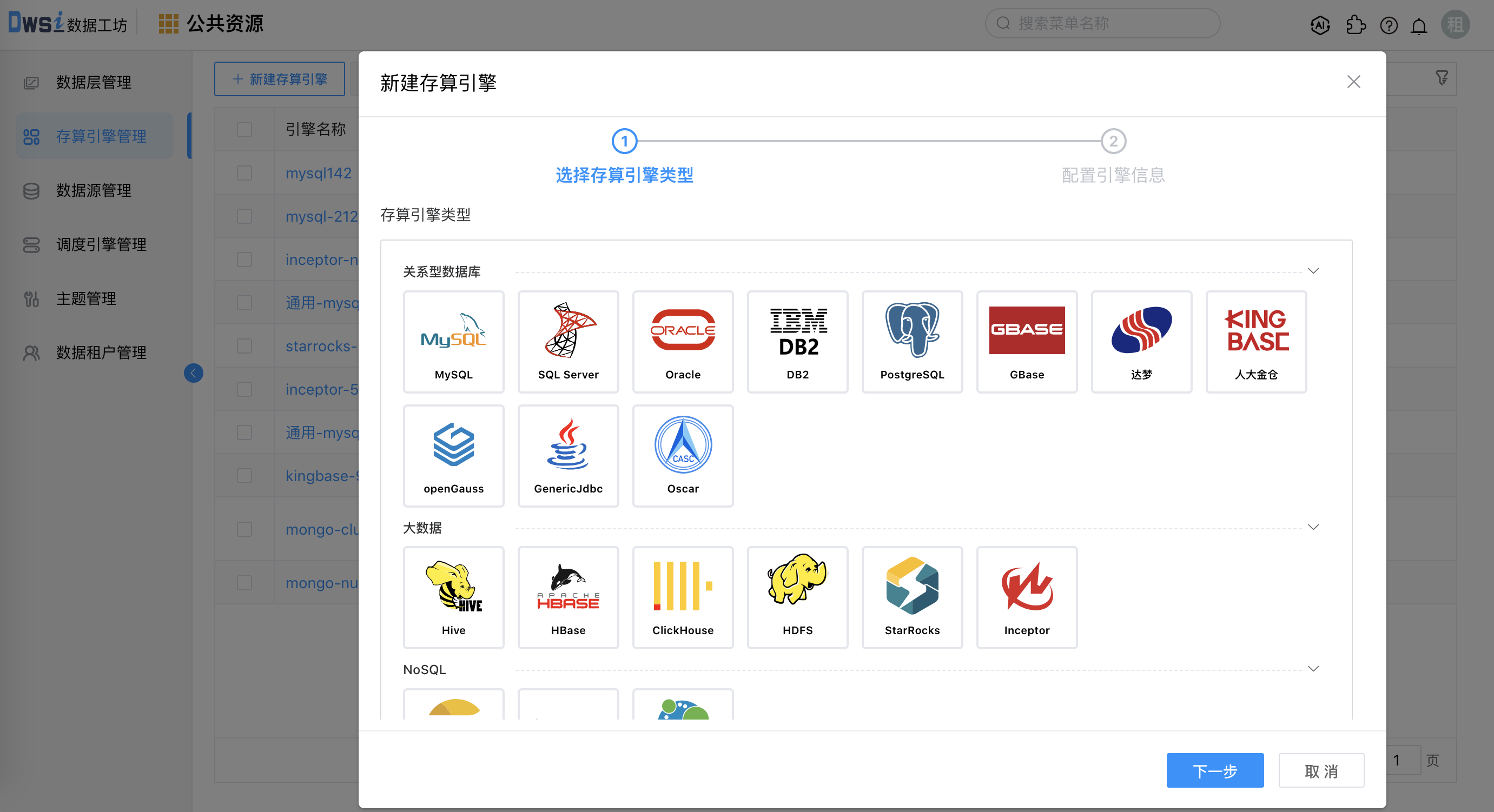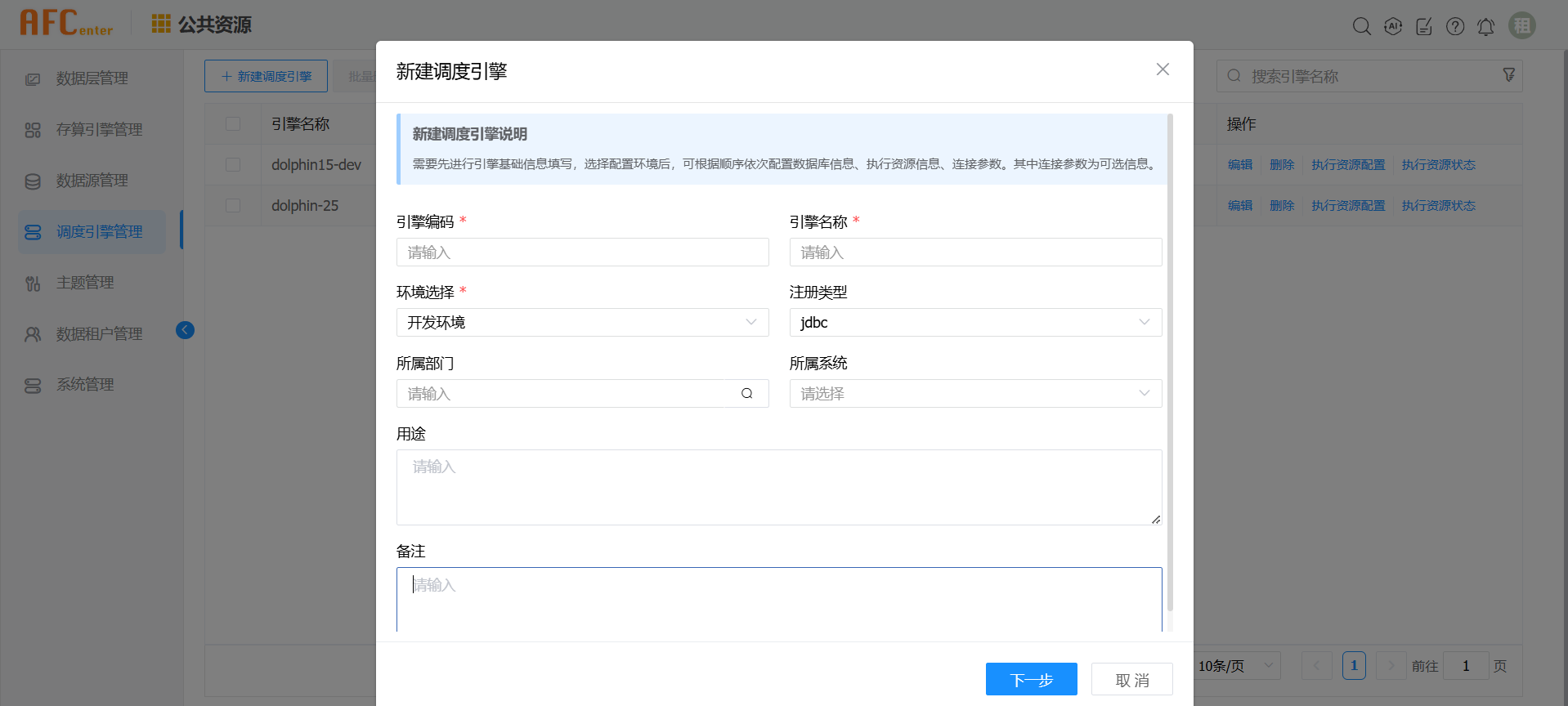 输入引擎名称、引擎编码、选择环境:开发环境,选择注册类型:jdbc,点击下一步。