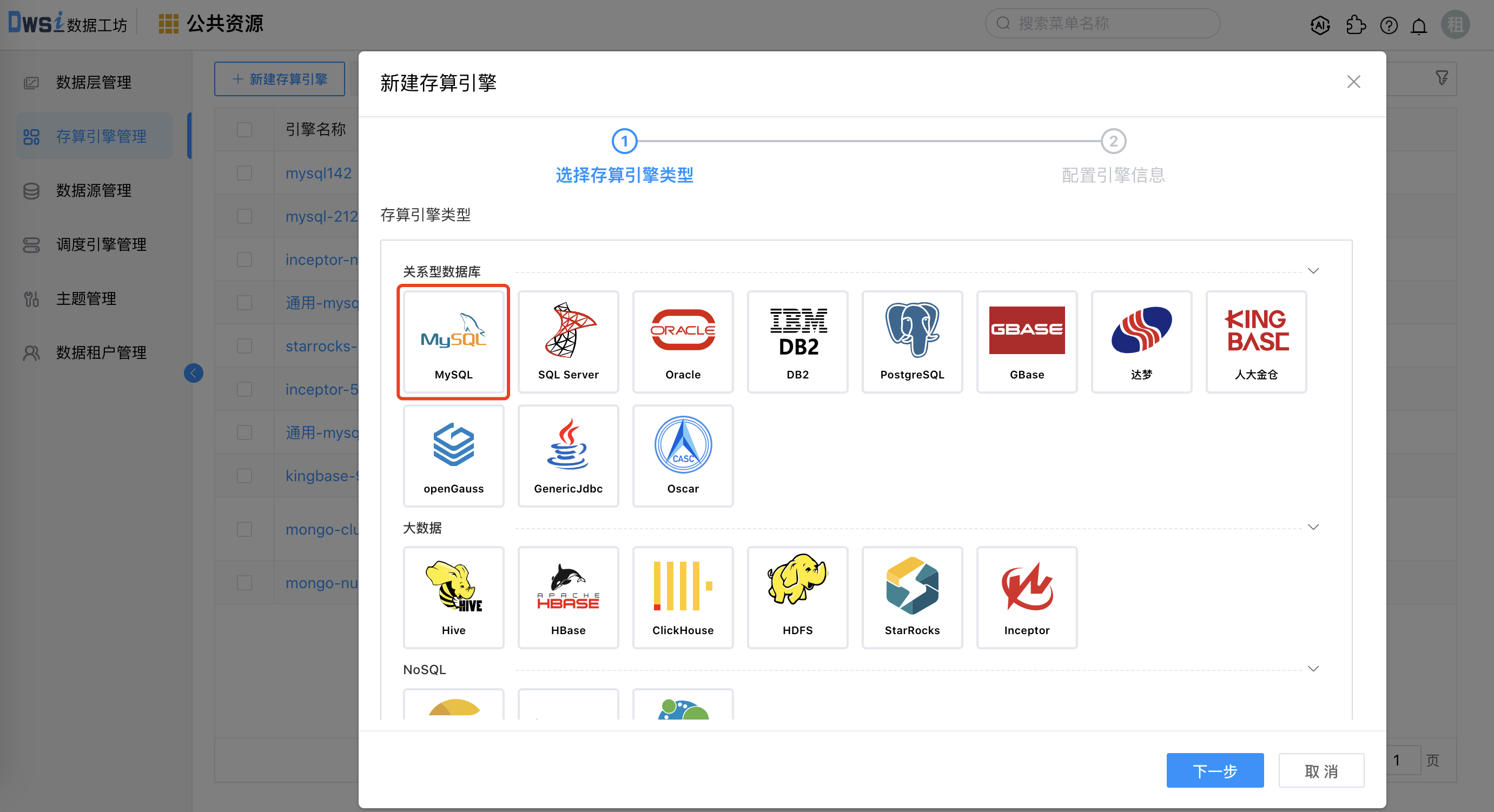 以创建MySQL类型引擎为例,点击关系型数据库分类下的MySQL图标,点击下一步,如下图。