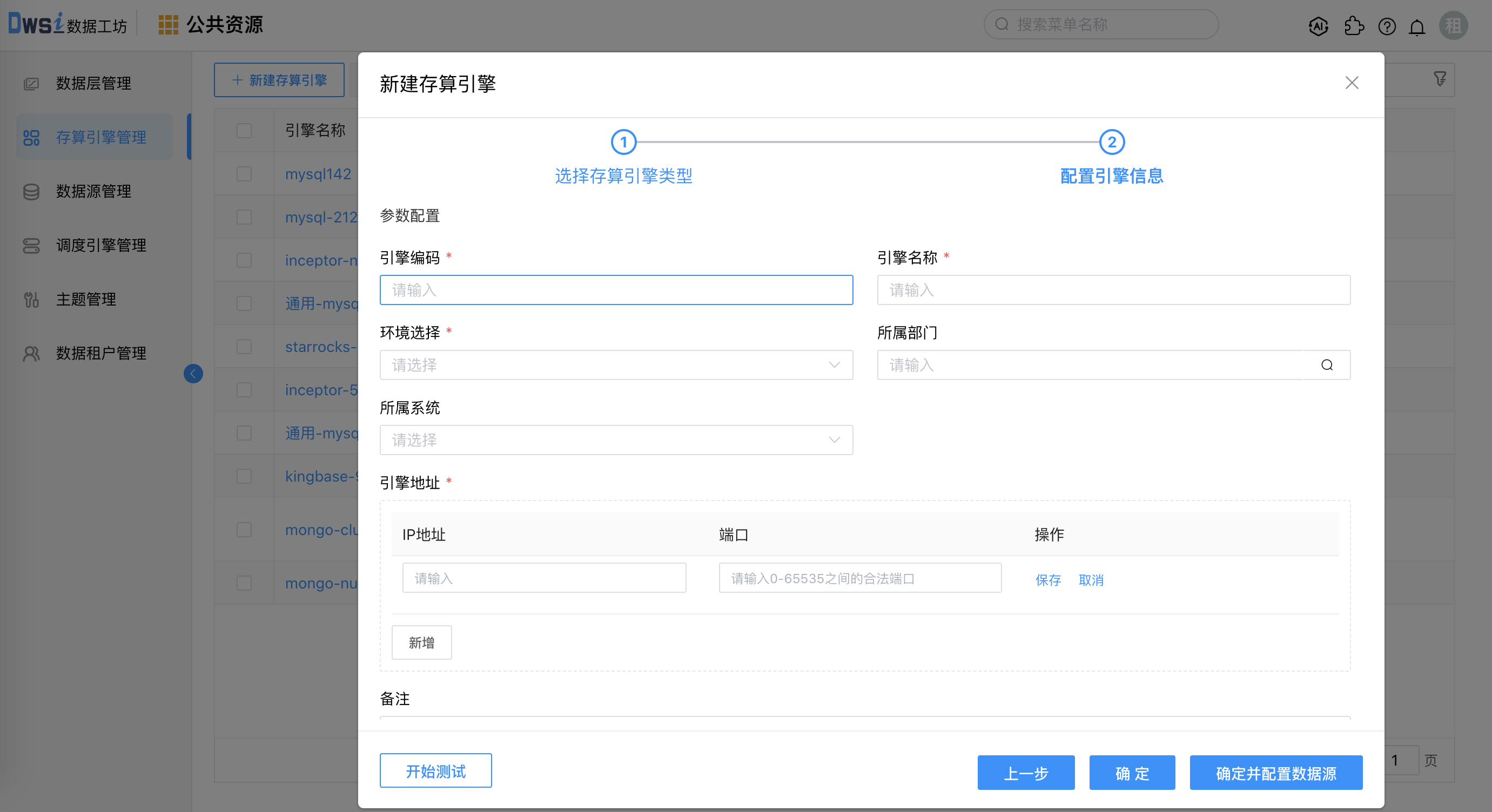 输入必填项:引擎编码、引擎名称、环境选择、引擎地址及引擎端口,点击开始测试按钮,测试成功后点击确定按钮保存引擎数据。