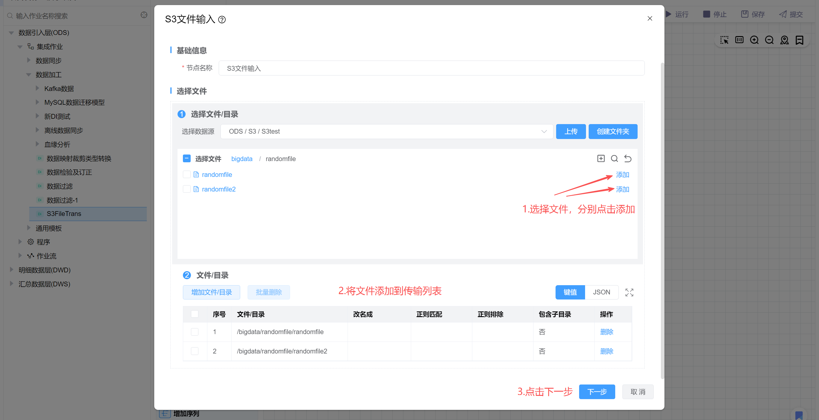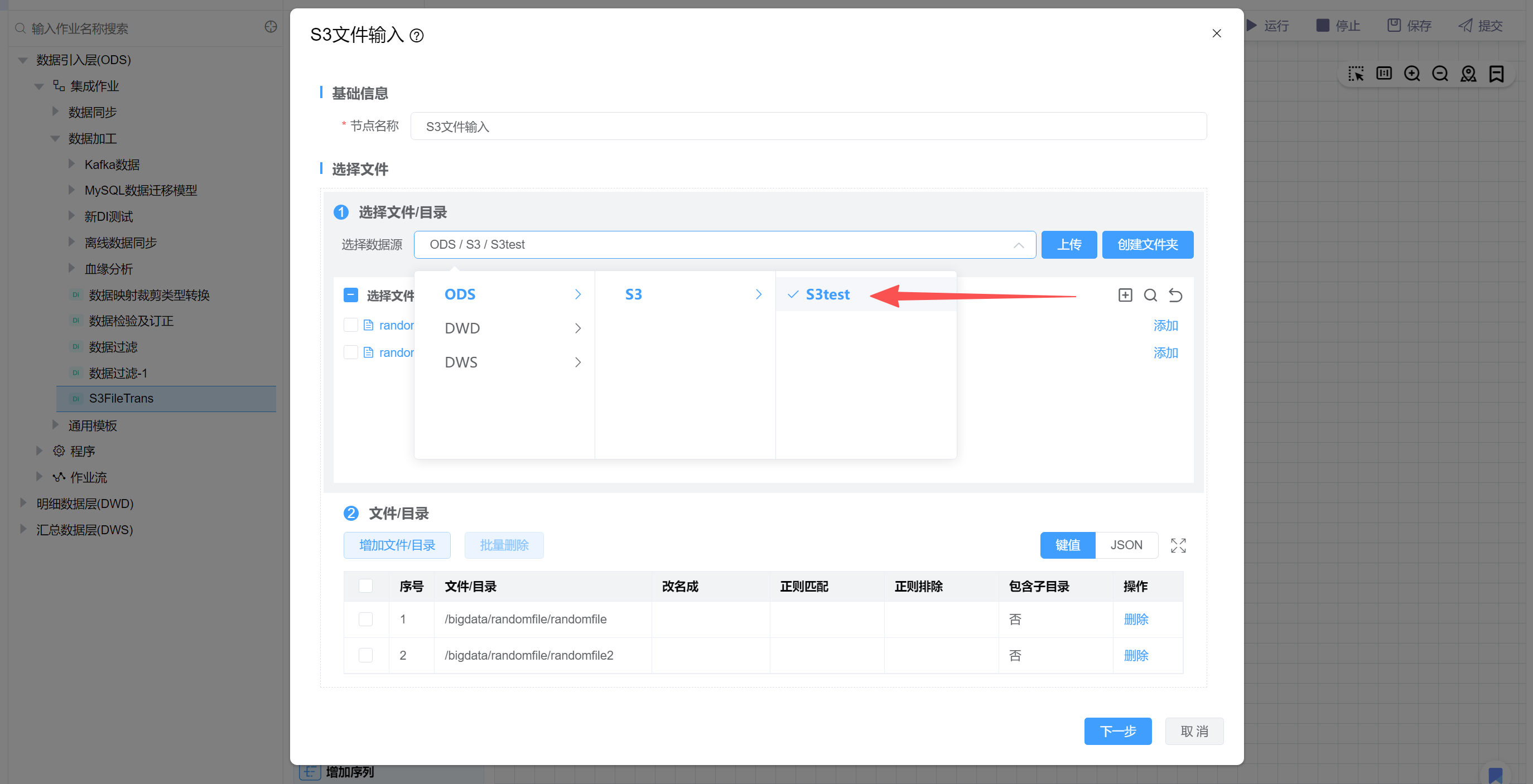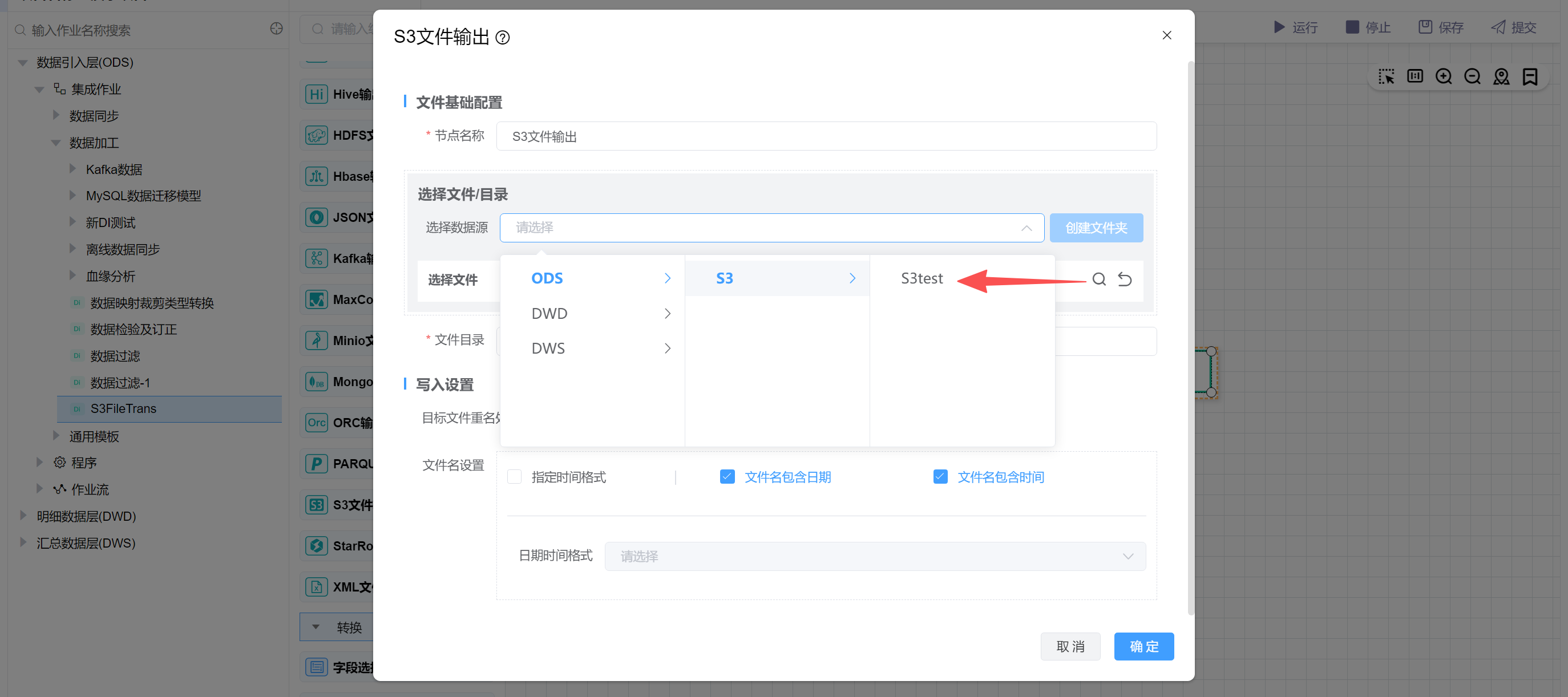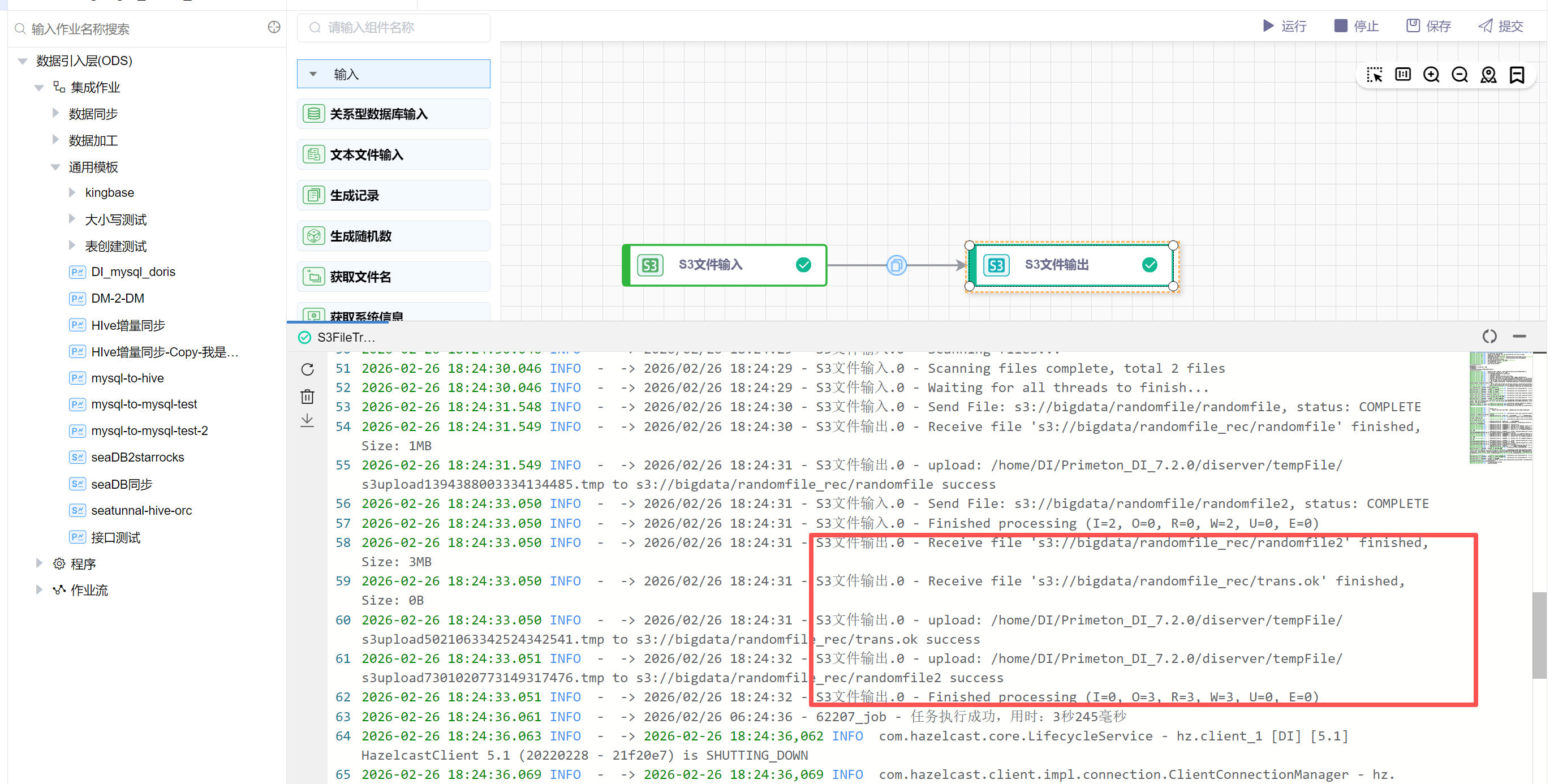 该场景读取S3某个目录下的文件,并写入到S3的其他目录中。在实际使用中'S3文件输出'可以根据需求换成'Minio文件输出'、'HDFS文件输出'等。 主要步骤如下: