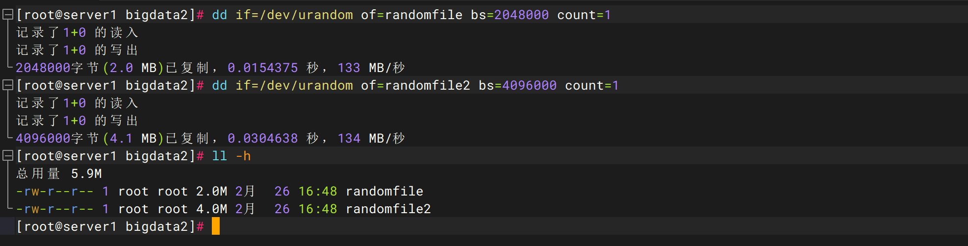 在linux环境上执行生成随机文件命令: