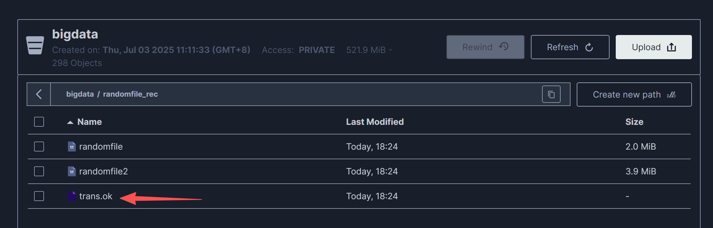 在S3中查看/bigdata/randomfile_rec目录,完成传输并生成了trans.ok目标标识文件。