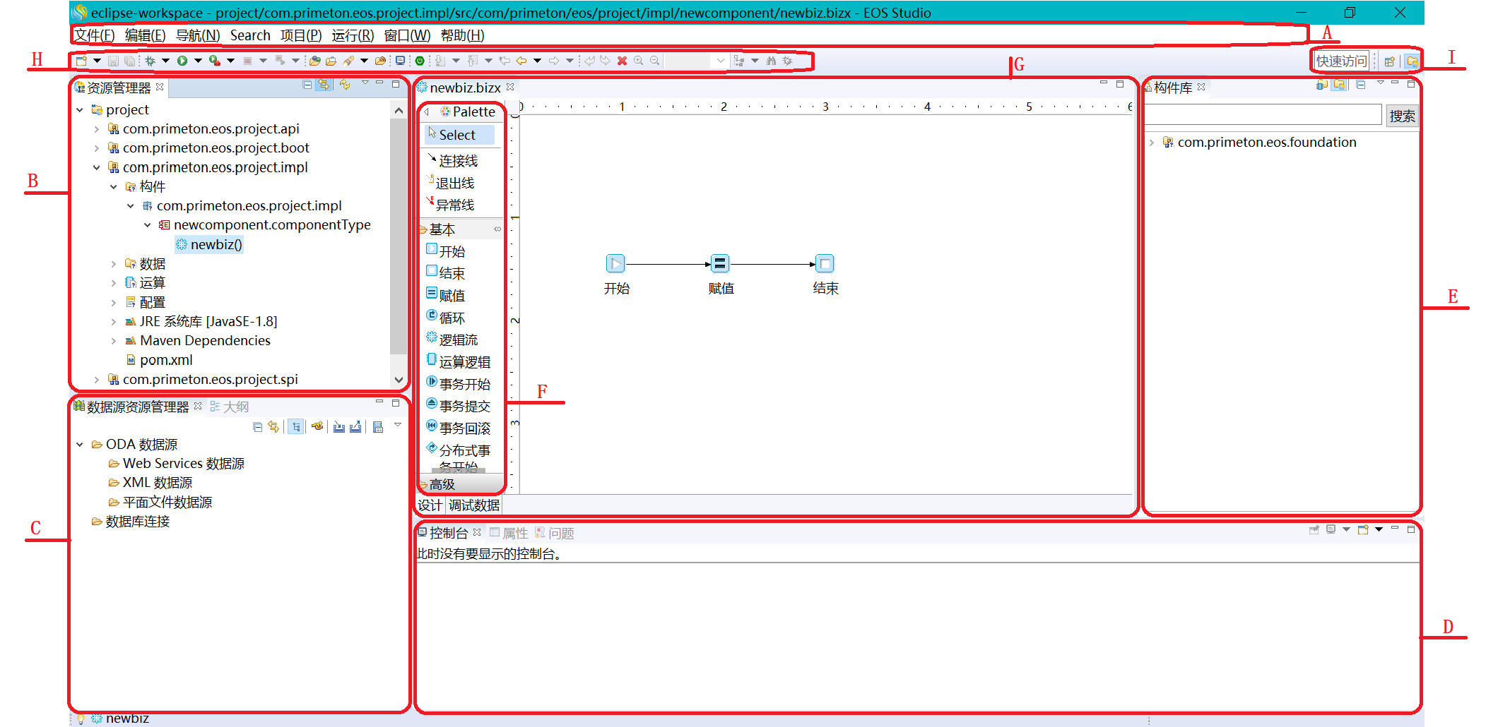 | “控制台”视图 | 显示服务启动的控制台输出信息。 | 开发透视图下方 |