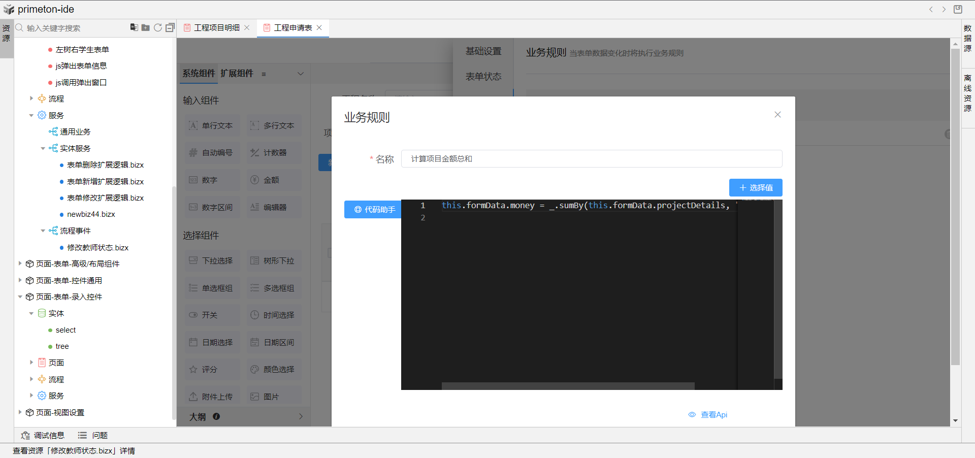 4.打开表单设置中业务规则,新建业务规则,输入名称-计算项目金额总和,在规则编辑器中写入如下js: