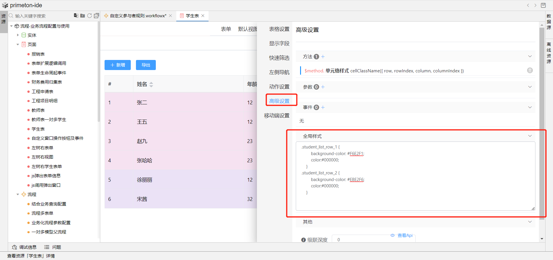 2.在高级设置中新建方法,选择右侧内置方法-单元格样式,根据自动生成的方法名与参数进行编辑js内容,判断如果性别为男,显示样式student_list_row_1,性别为女显示样式student_list_row_2。