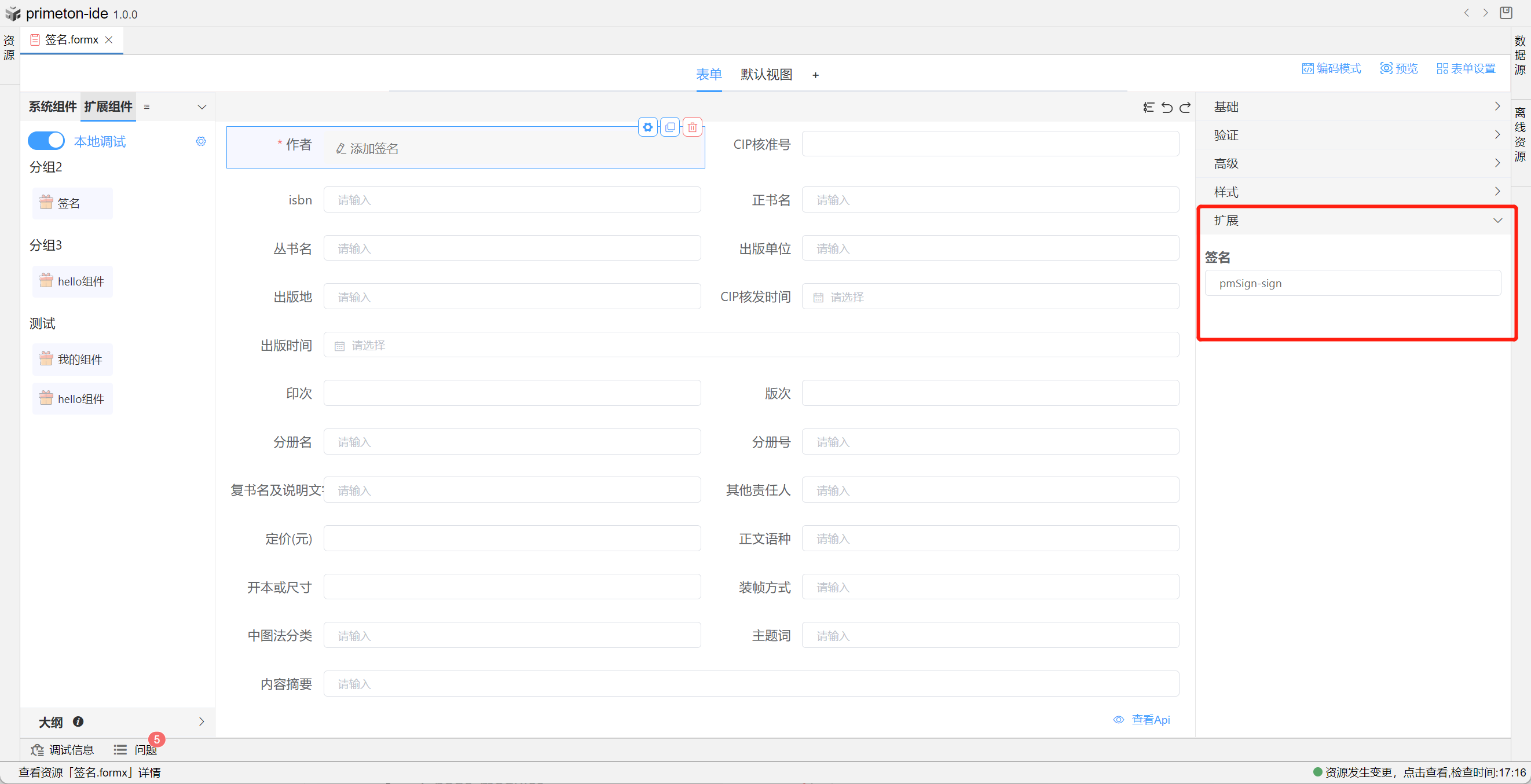 上传组件后,打开组件选择区的扩展组件界面,拖拽对应扩展组件到表单编辑区,添加成功后可看到扩展组件页面