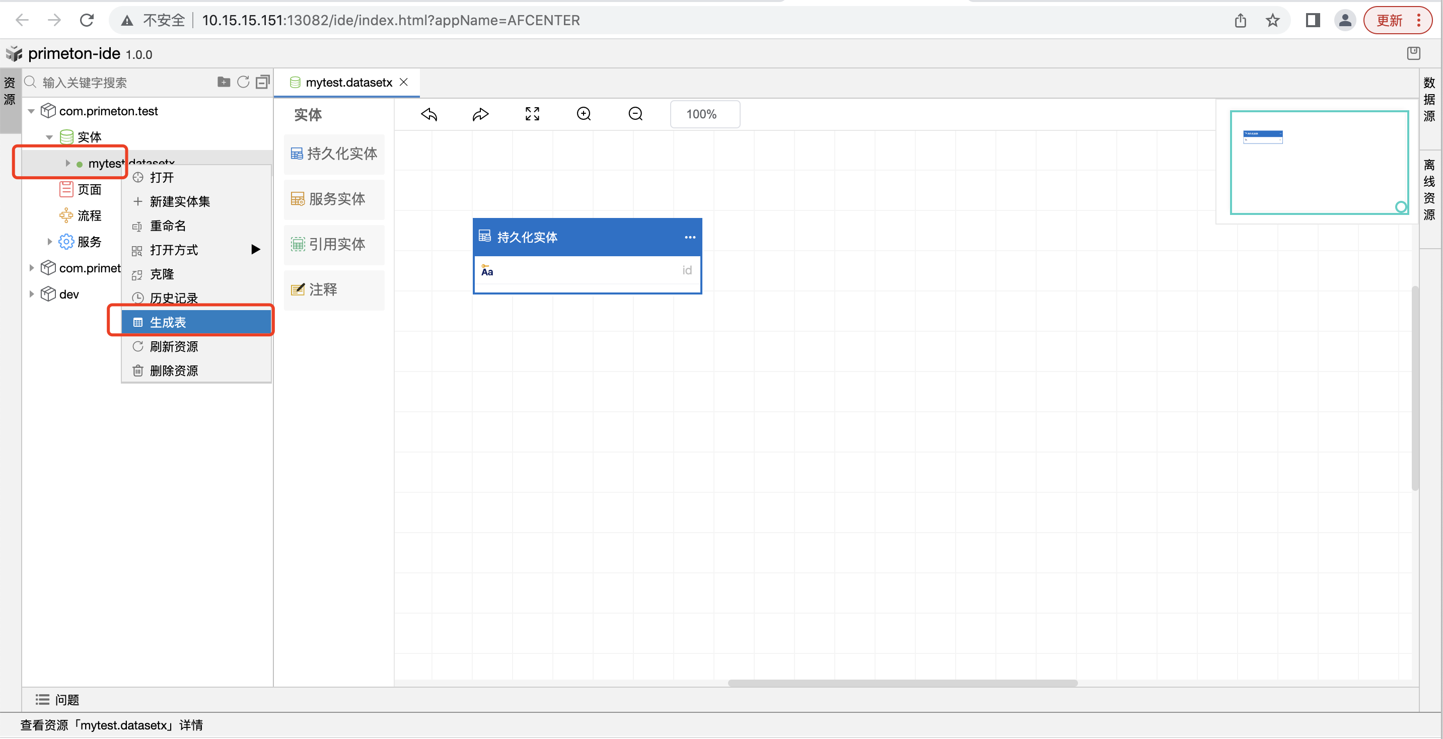 引用实体还可以从资源树中,选择其他实体集的持久化实体,拖入到画布中。示例是从test实体集拖入实体到本实体集中。
