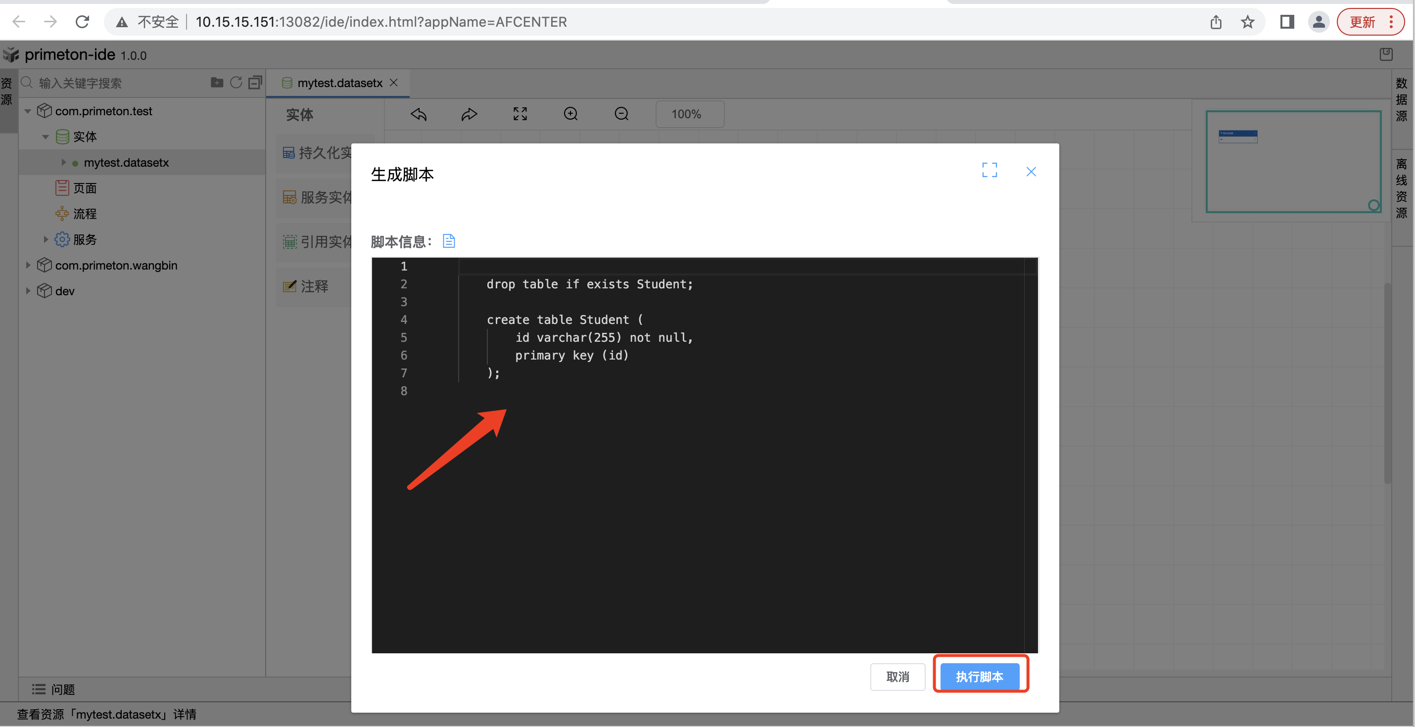 弹出生成脚本弹框,默认脚本信息内容为生成本实体集下所有的数据库表,可以对脚本信息进行修改。点击生成脚本按钮,操作生效,按照脚本信息生成对应的表。
