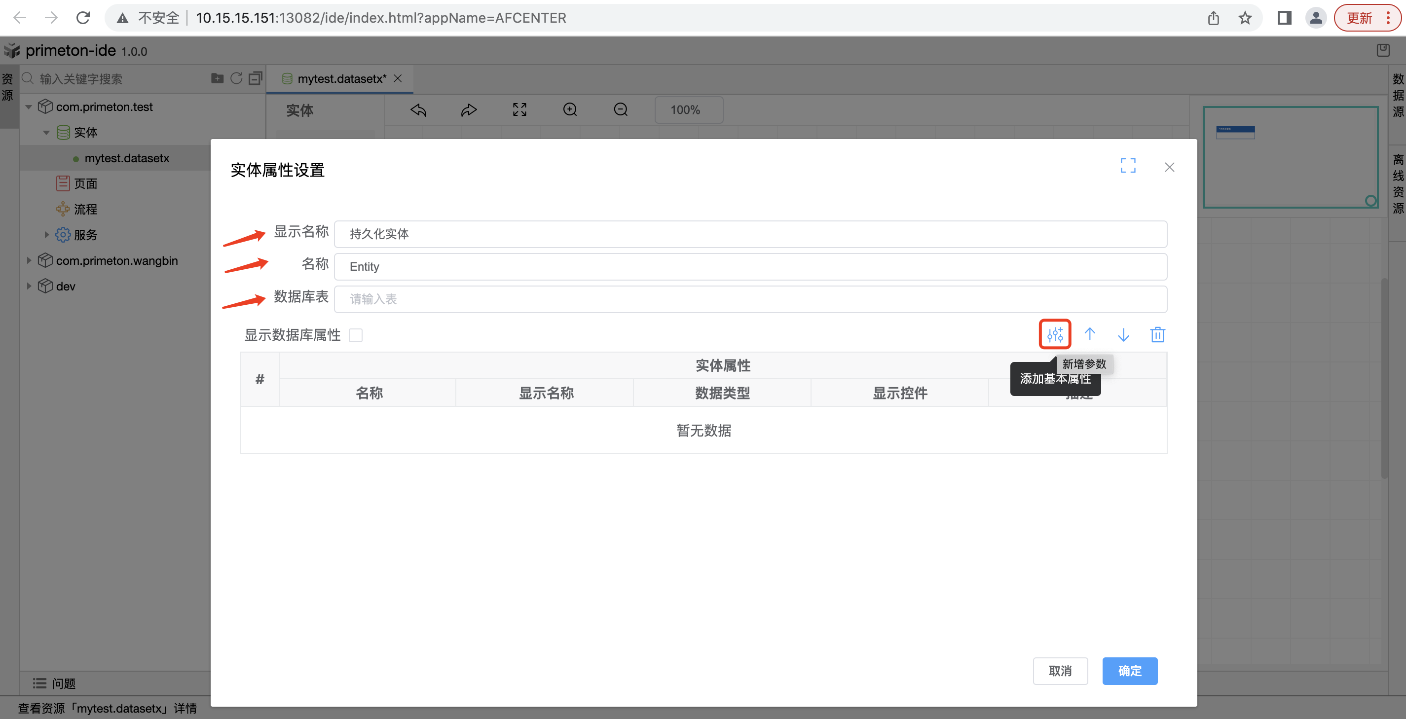 双击服务实体,可以对实体进行配置。可以对实体进行修改显示名称、修改名称、添加基本属性、上移下移、删除属性的操作。