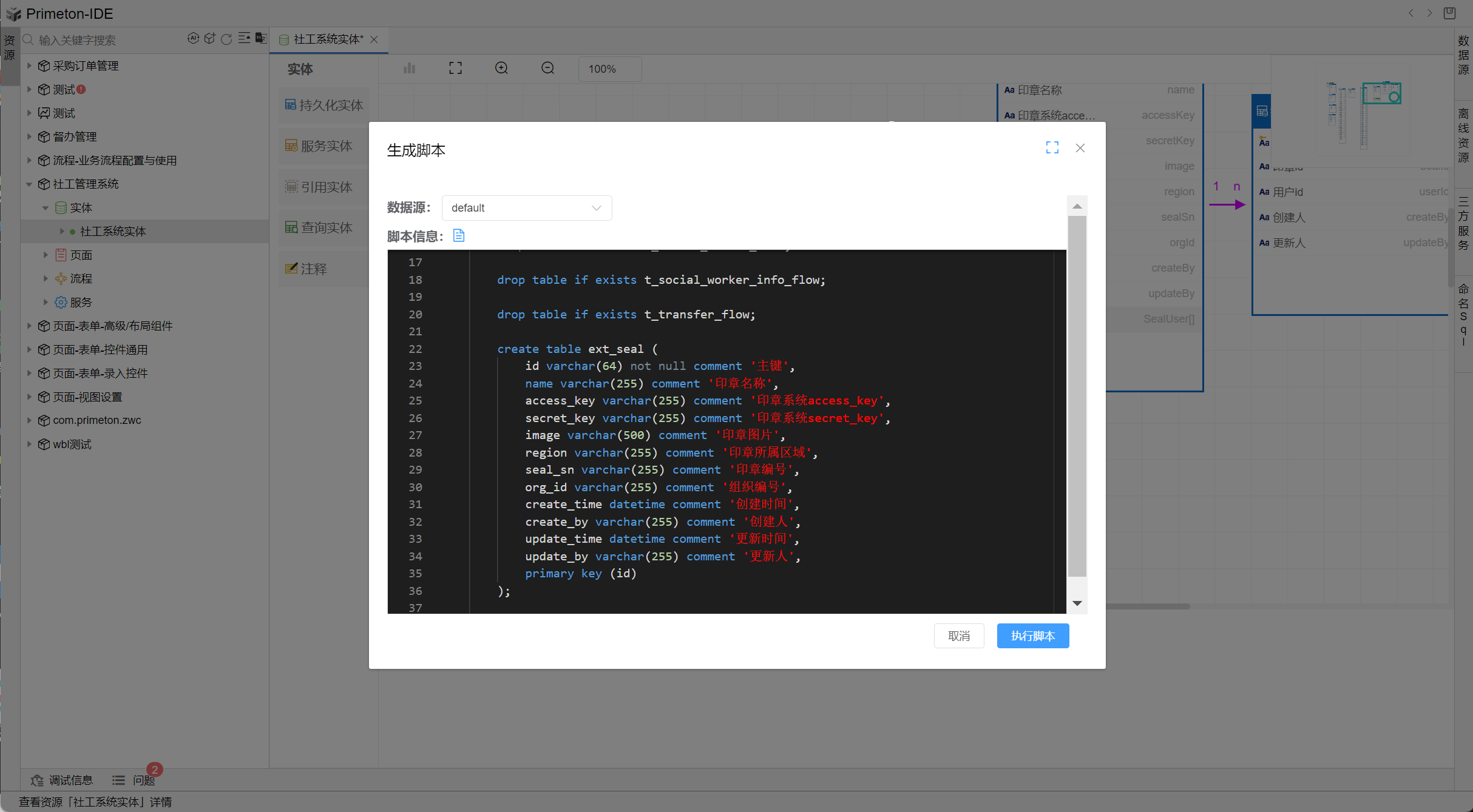 根据用户所选择的实体,将单独生成创建表的SQL语句。用户可以自由修改生成的SQL语句,并选择合适的数据源进行操作。