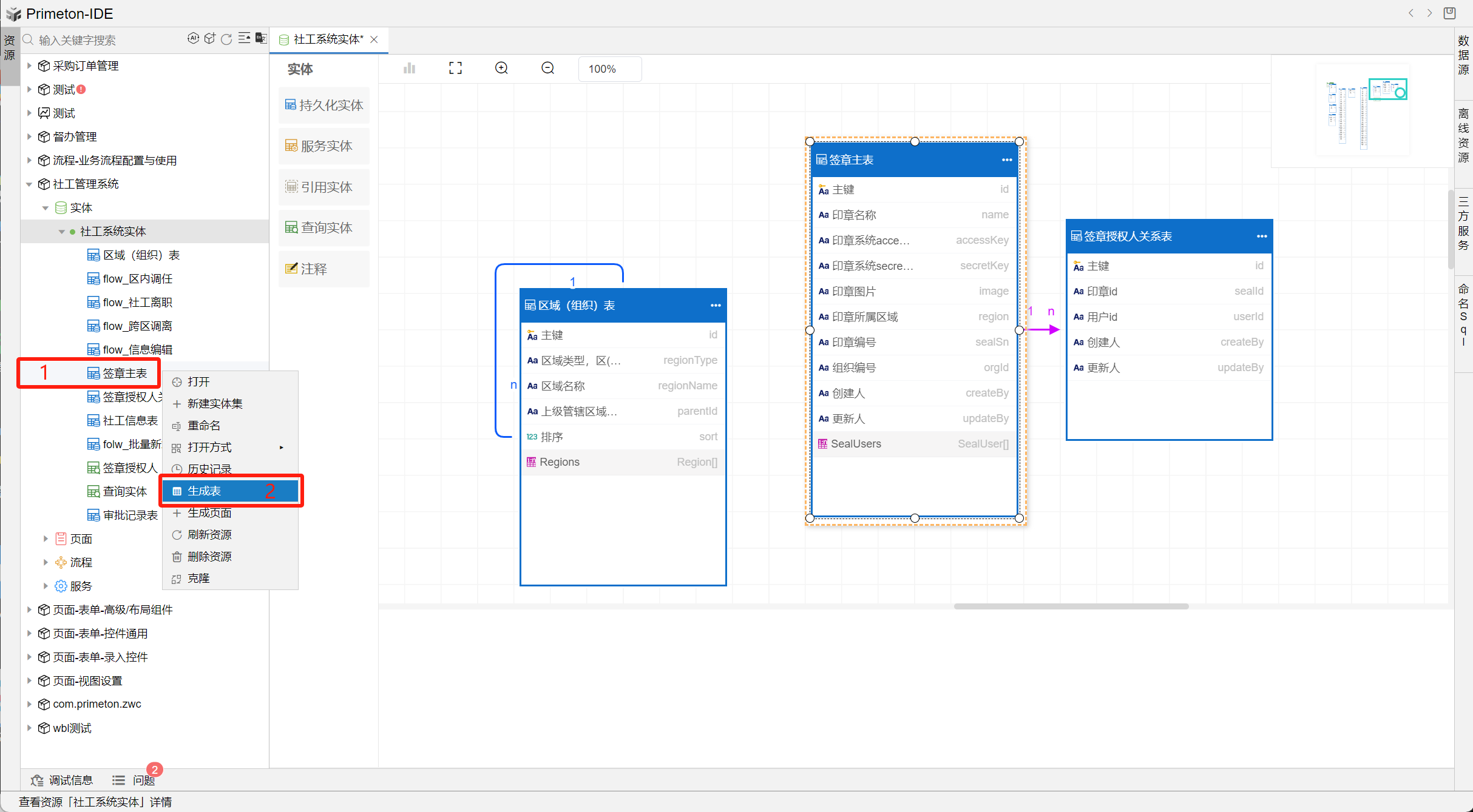 操作:右键点击需要生成表的实体,选择菜单中的生成表。