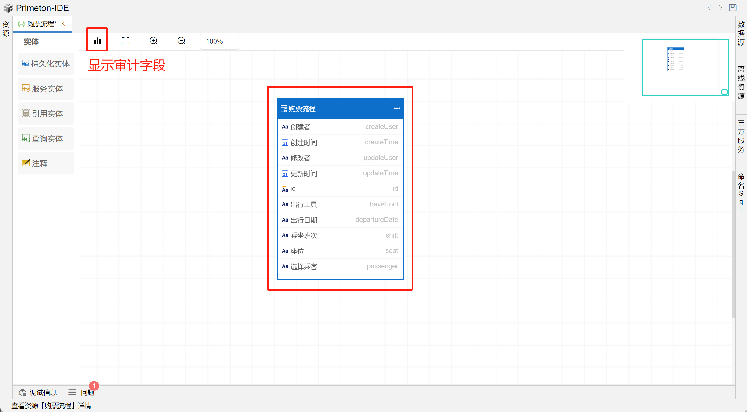 工具栏为用户提供了是否显示审计字段、画布全屏展示、放大画布、缩小画布、调整画布百分比的操作按钮,用户只需单击相应的图标即可执行相应的命令。