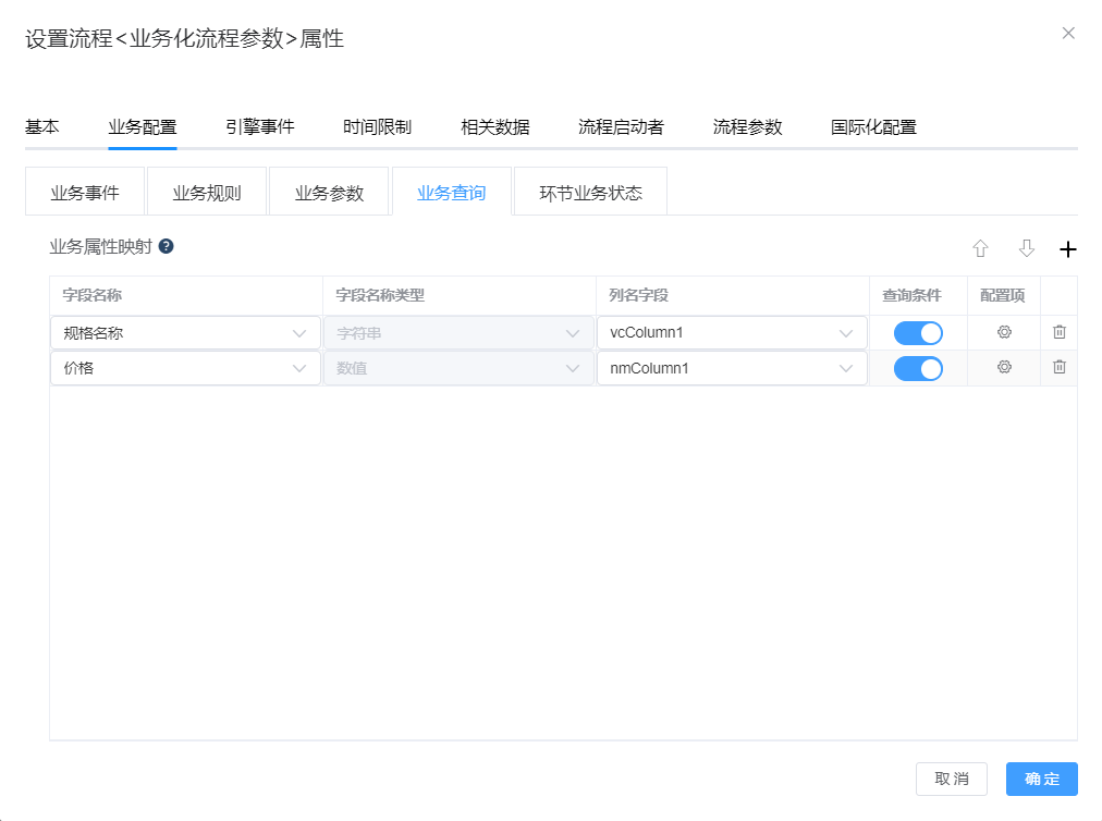 - 在创建好的业务流程中,双击空白面板,打开流程属性弹窗,选择最右边业务查询tab页。新增业务查询,选择好表单中的业务字段和对应的列名字段,打开查询条件开关。