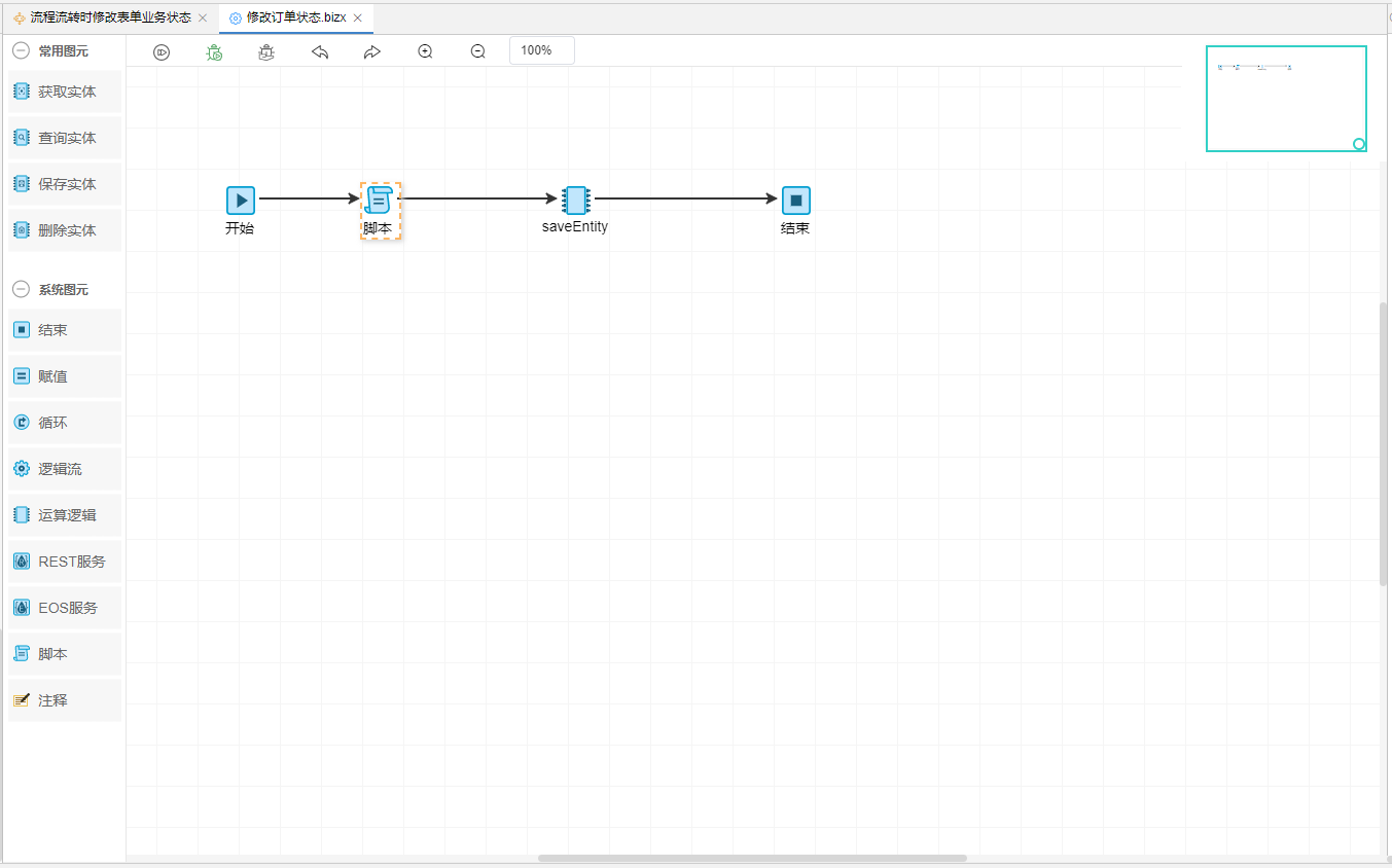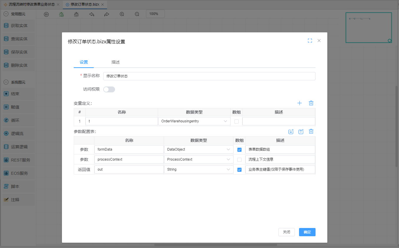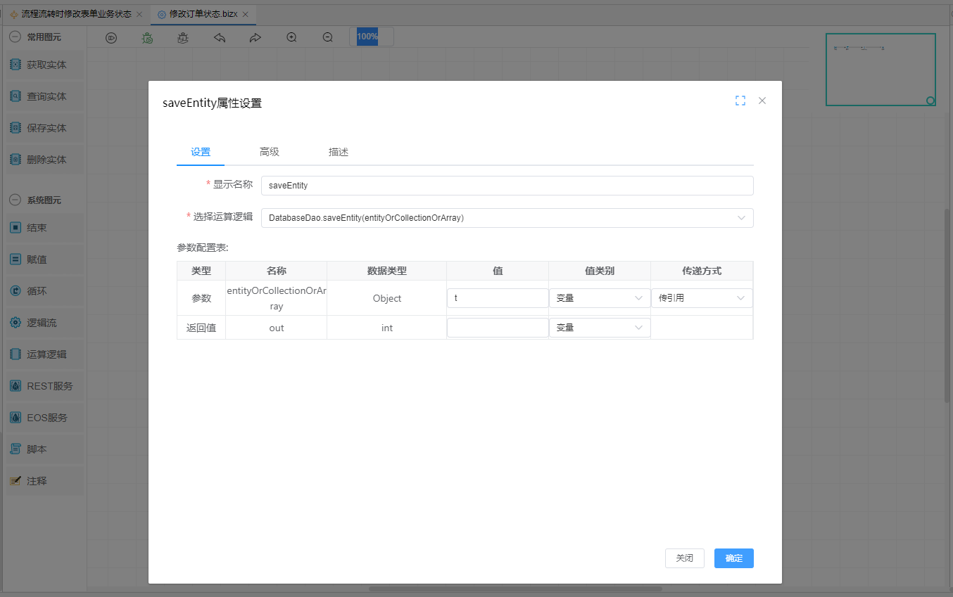 //逻辑流内formData规定为数组,这里的formData[0]为取表单内的实体对象为定义变量t赋值 context.t=formData[0]; //判断订单实体对象t中参数status如果是空,表明为流程发起提交环节,设置订单信息审核状态为提报;不为空调用该逻辑流时则表明审核通过,设置教师状态为审核已完成 if(context.t.status == null){ context.t.status = "applying"; }else{ context.t.status = "审批已完成" ; }使用逻辑流图元,双击打开逻辑流图元,使用save方法,传入变量t给逻辑流,点击保存关闭弹窗即完成逻辑流配置。