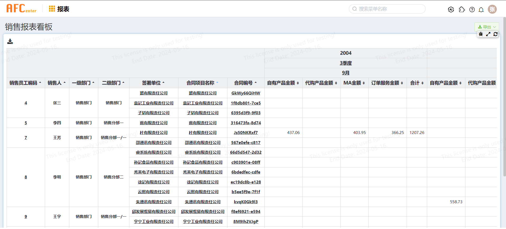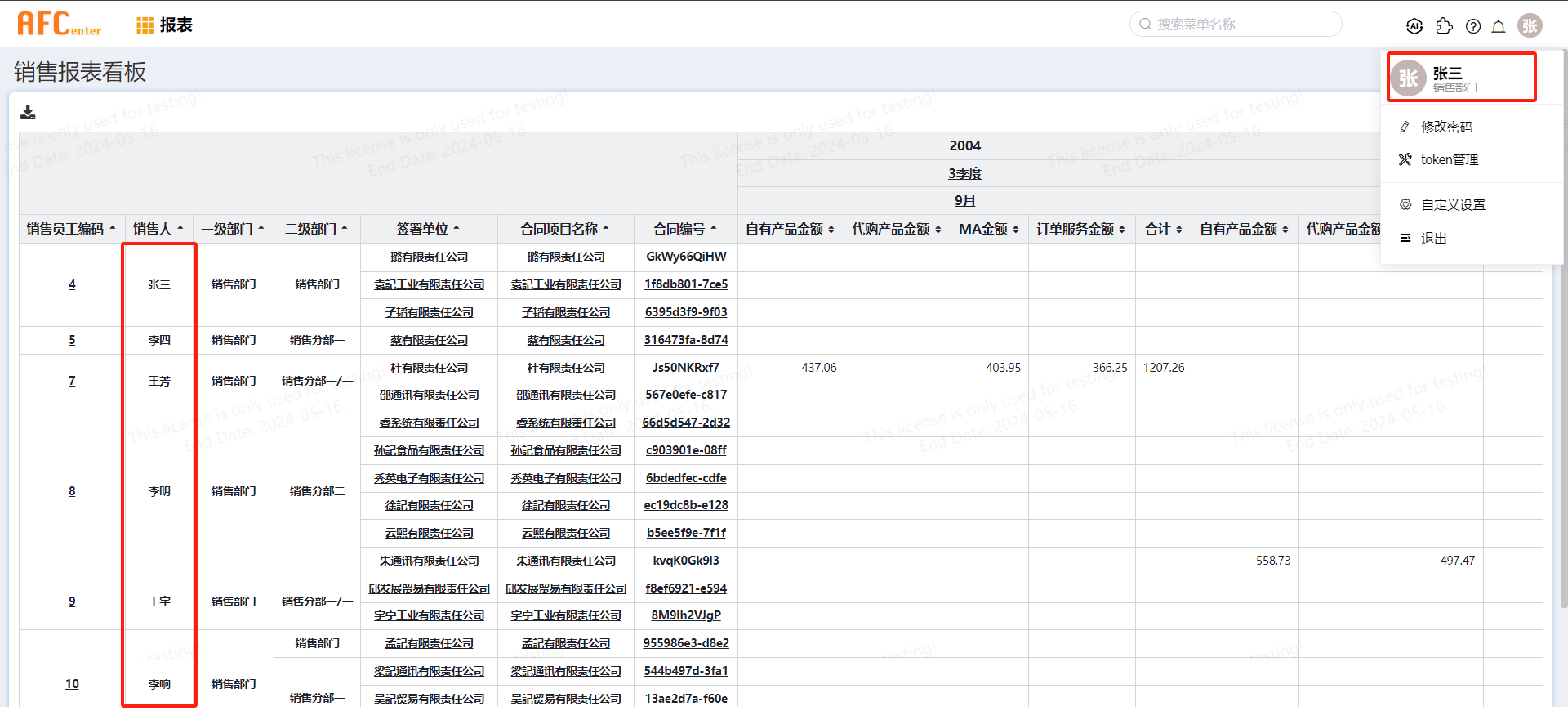 注:该案例中不提供示例数据,销售业务数据表中的销售员工编码和销售人,实际需要和AFCenter员工表中的ID和NAME字段值对应,才能通过获取当前登录用户的员工id来对报表的数据显示做范围控制。