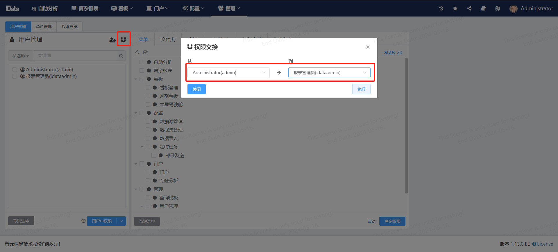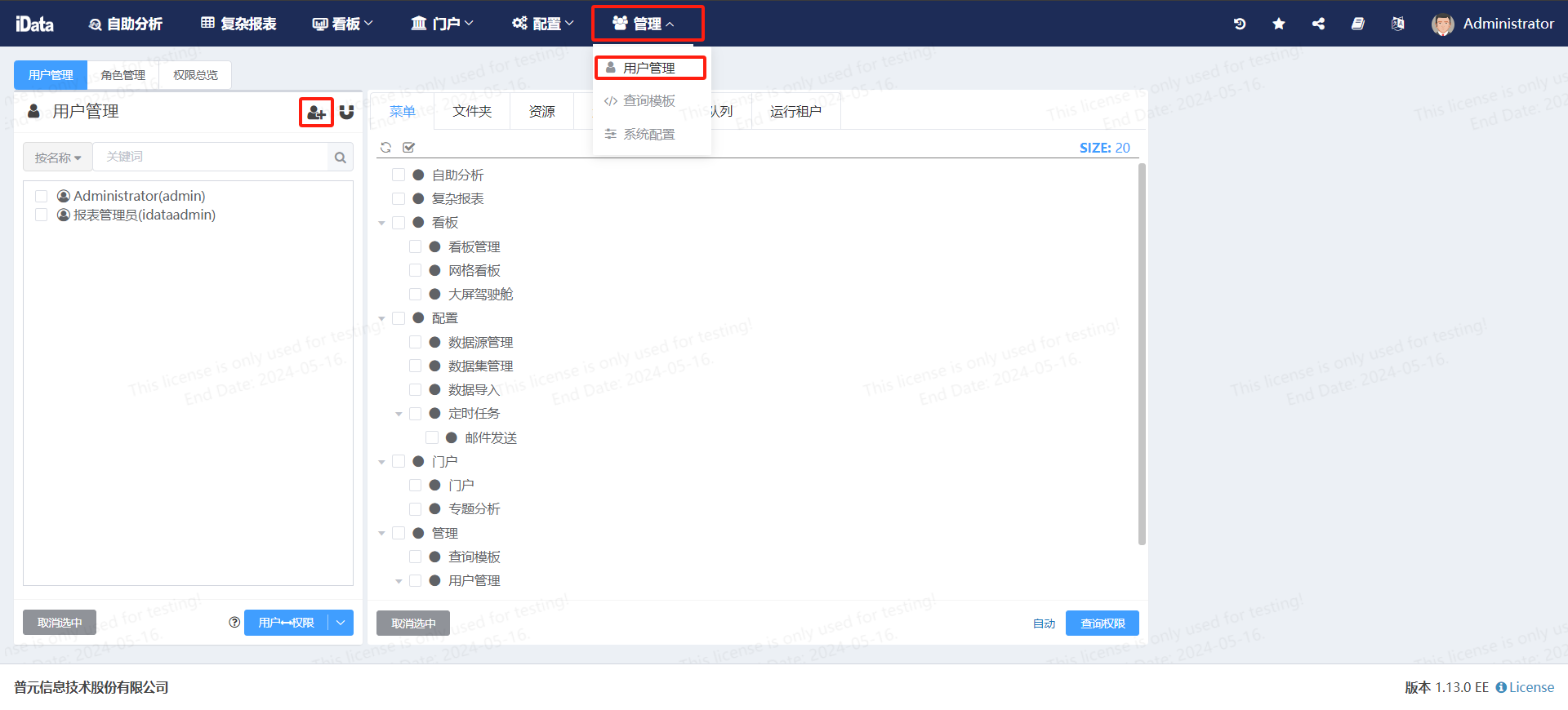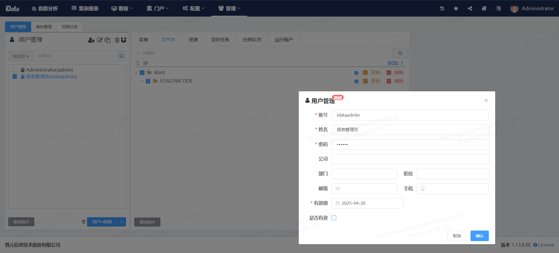 iData平台-管理-用户管理,创建一个报表数据管理员(idataadmin),同时把Administrator(admin)用户权限交接至报表数据管理员(idataadmin)。